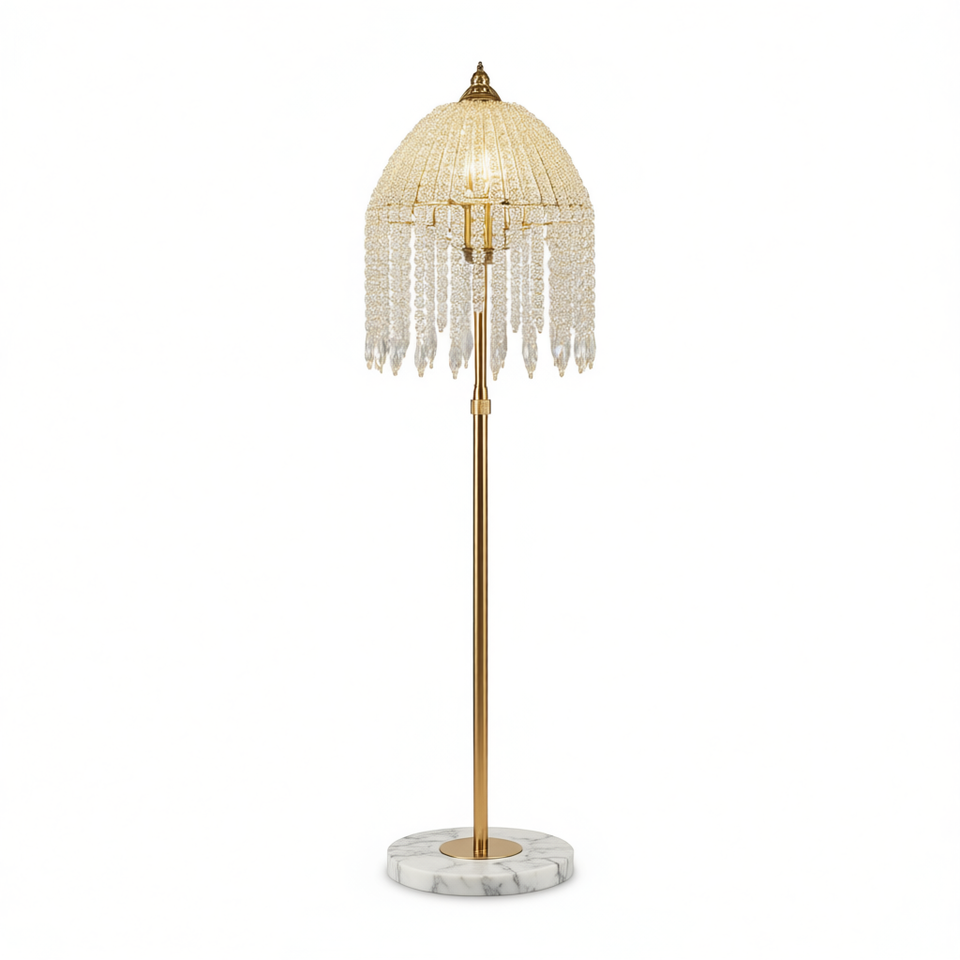 Lampada da Terra a 3 Luci in Ferro Dorato con Cristalli e Perle a Cascata, Base in Marmo per Soggiorno e Ufficio, Elegante Design con Paralume a Cupola