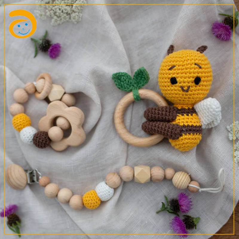 Set di 3 Sonagli a Forma di Ape per Neonati, Regalo per Baby Shower, Set di Sonagli all'Uncinetto con Clip per Ciuccio e Massaggiagengive in Legno Fatto a Mano