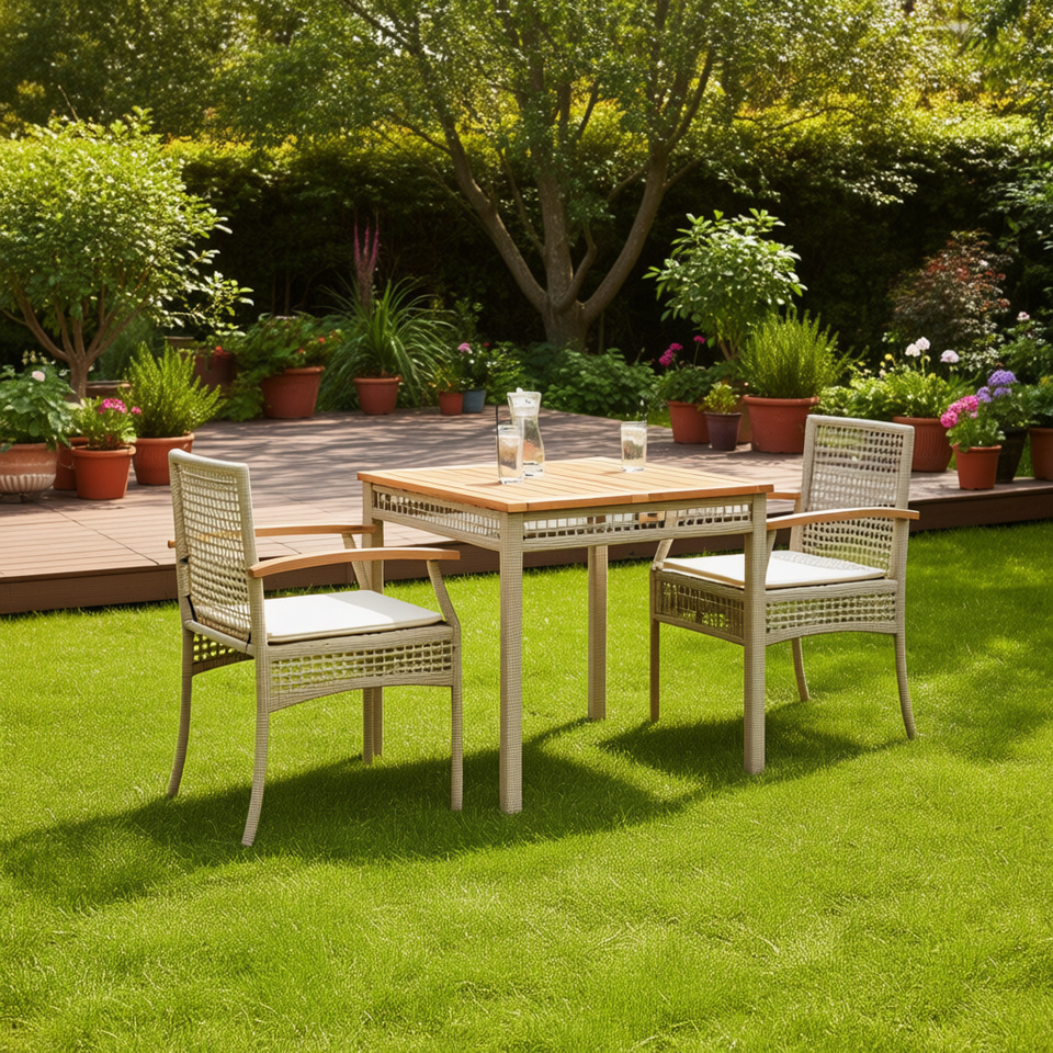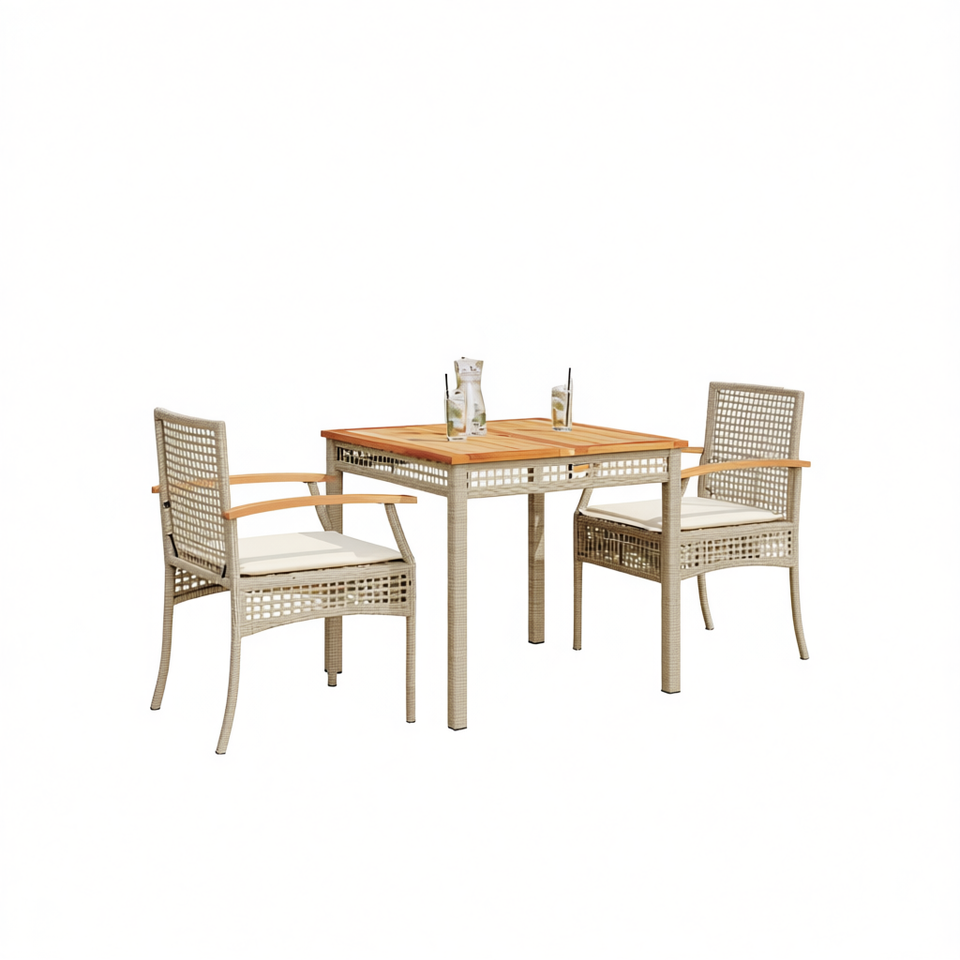 Set da Pranzo da Giardino in Rattan PE Beige per 2 Persone, Arredamento da Esterno Resistente alle Intemperie, Design Contemporaneo con Piano in Teak