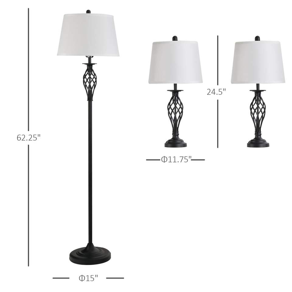 3-Piece Living Room Bedroom Lamp Set Black and White Floor and Table Lamps With Metal Pole and Round Base Fabric Shade