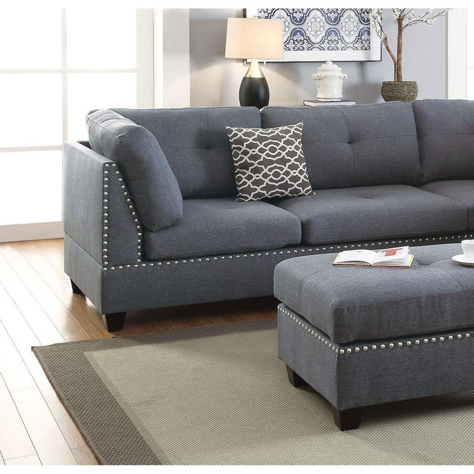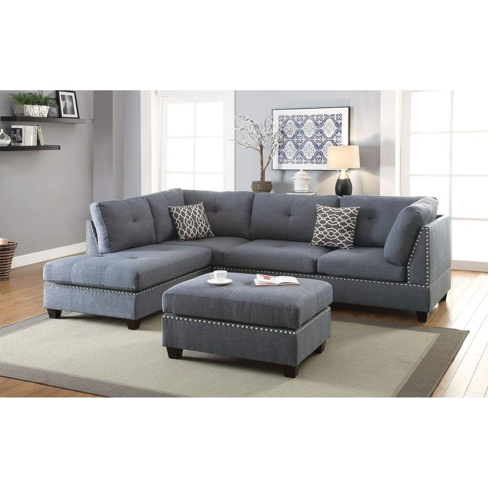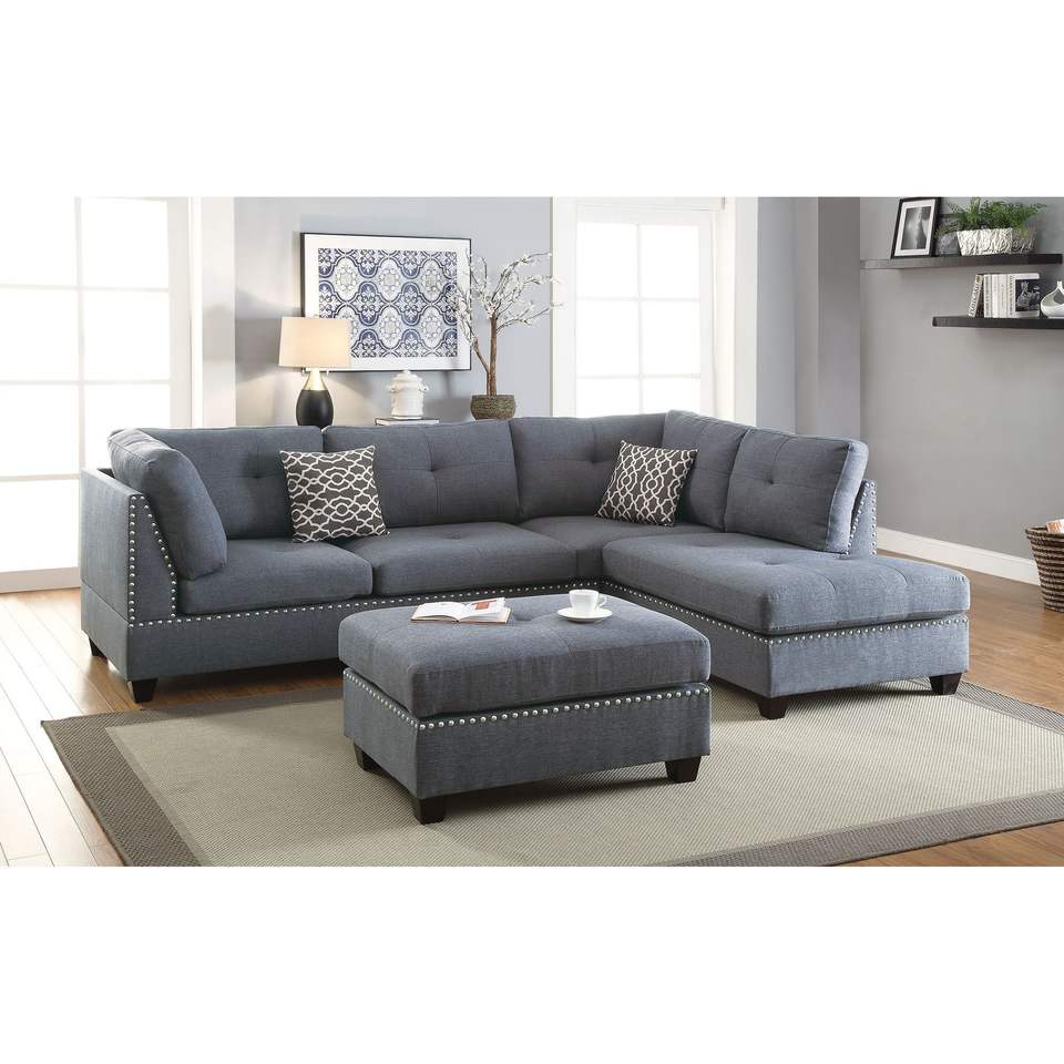 Divano Sezionale Reversibile in Polifibra Blu-Grigio a 3 Pezzi con Chaise Longue e Pouf, Cuscini Inclusi per Soggiorno