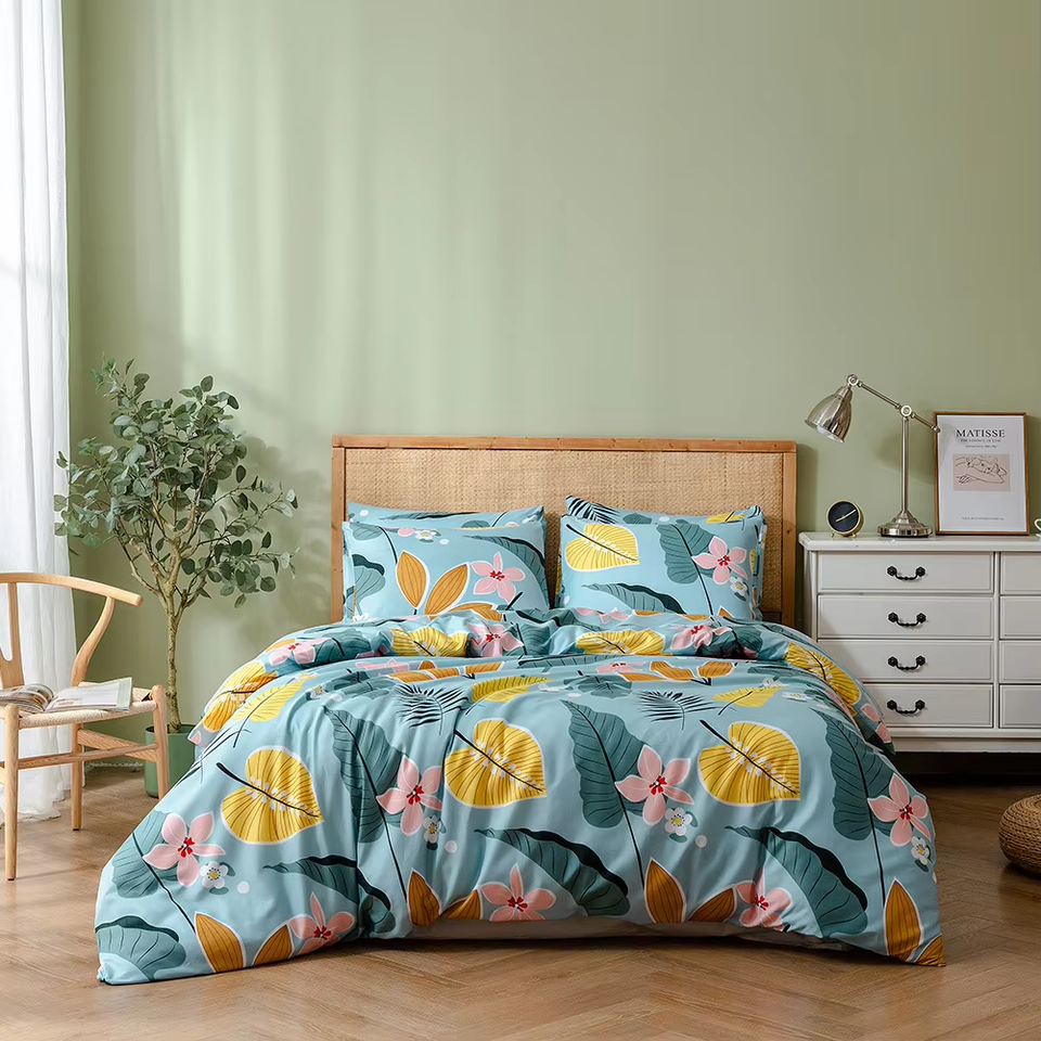 Set di biancheria da letto tessile per la casa estiva in 3 pezzi. Copertura in poliestere spazzolato con stampa floreale, set di lenzuola e federa