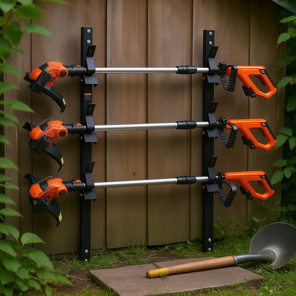 Porta Attrezzi da Giardino a Parete in Lega di Zinco, 3 Posti, Telaio in Metallo Verniciato a Polvere Nera per Decespugliatori, Sarchiatoi e Attrezzi da Giardinaggio