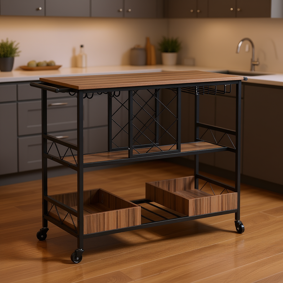 Carrello Bar a 3 Ripiani con Portabottiglie e Portabicchieri, Carrello da Cucina in Legno, Capacità 136 Kg, Design Moderno
