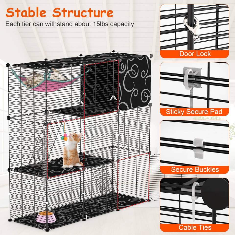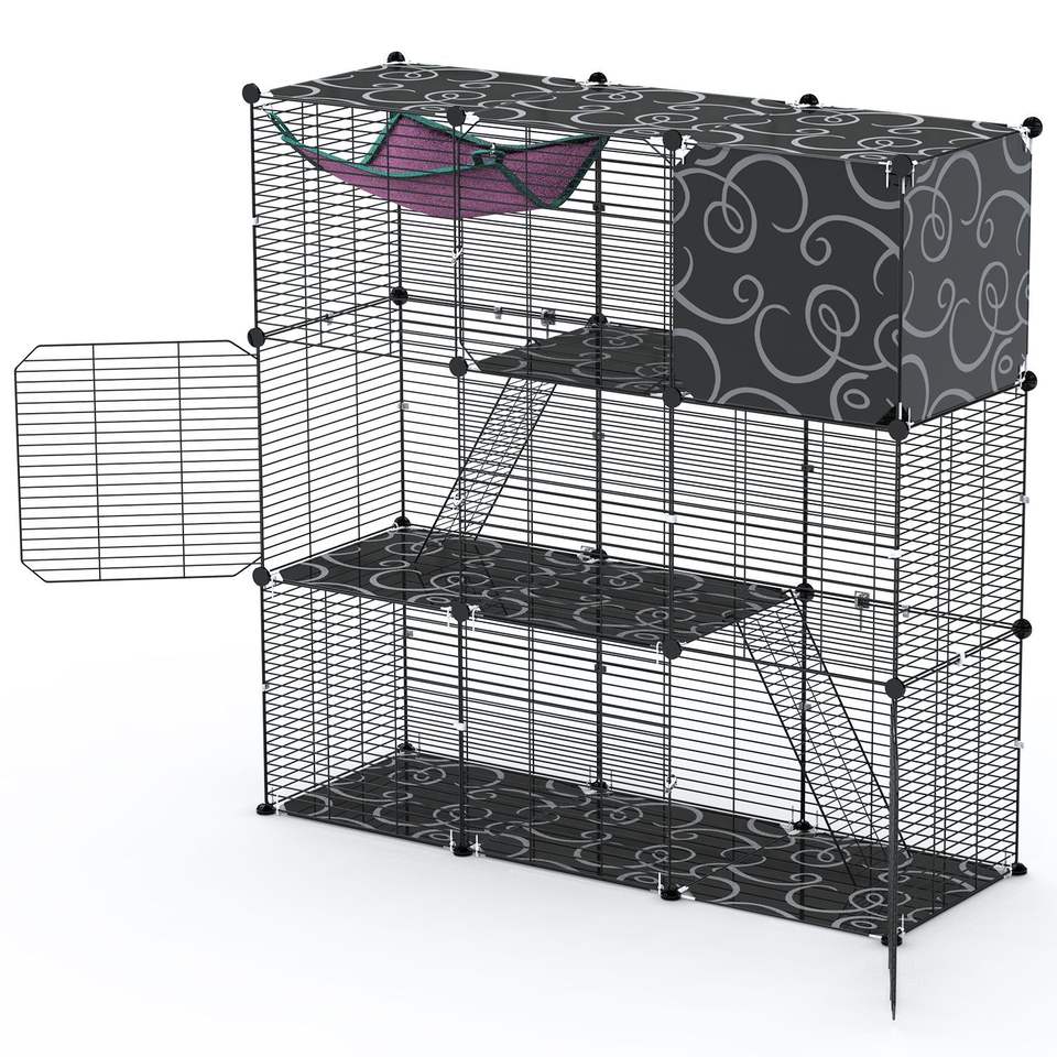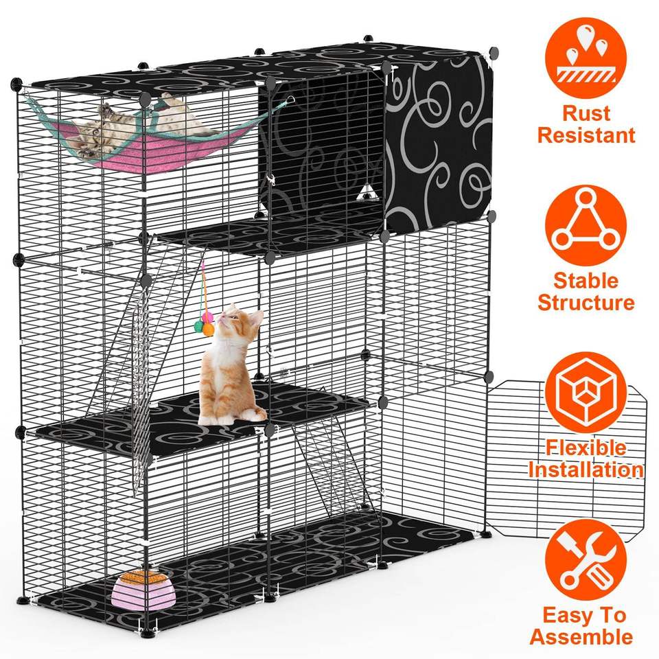 Gabbia per Gatti a 3 Livelli Fai-da-Te in Filo Metallico, Recinto Interno con Amaca, Palla Giocattolo e Scala, Cuccia per 1-2 Gatti