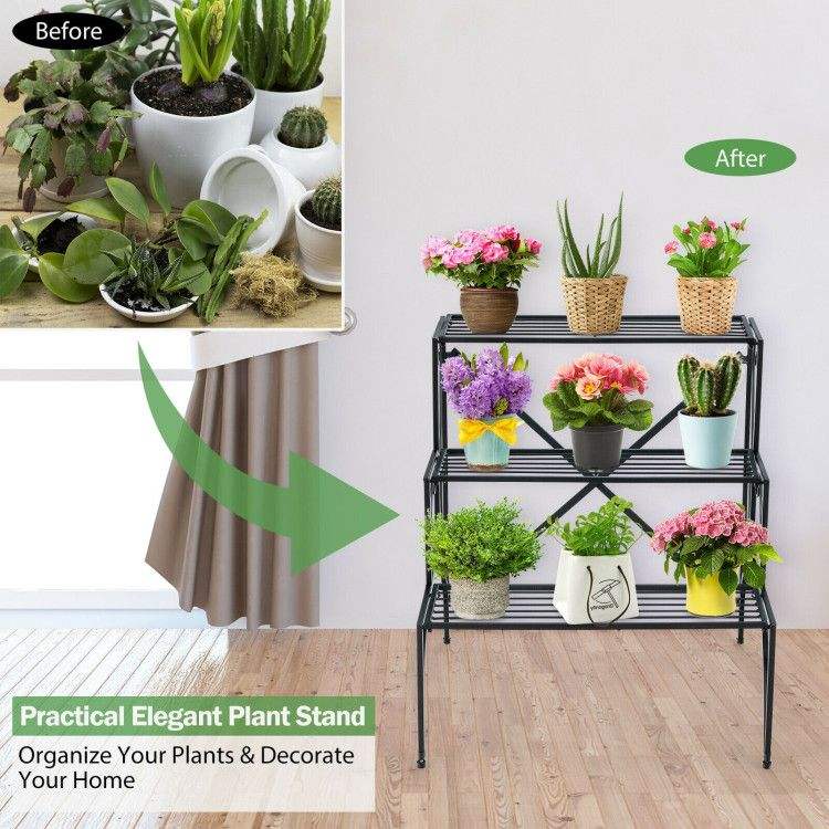 Supporto per Piante a 3 Livelli in Metallo con Ripiani a Griglia Allargati per Giardino, Portico, Capannoni e Depositi