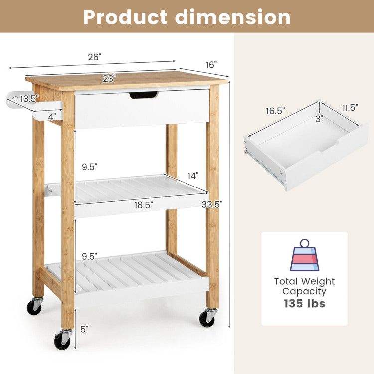 Carrello di Servizio a 3 Ripiani con Piano in Bambù, Carrello da Cucina Multifunzione