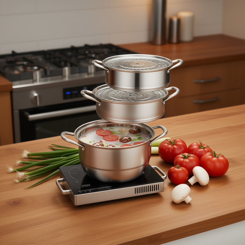 Pentola a vapore a 3 livelli in acciaio inox con coperchio per fornelli a gas e a induzione