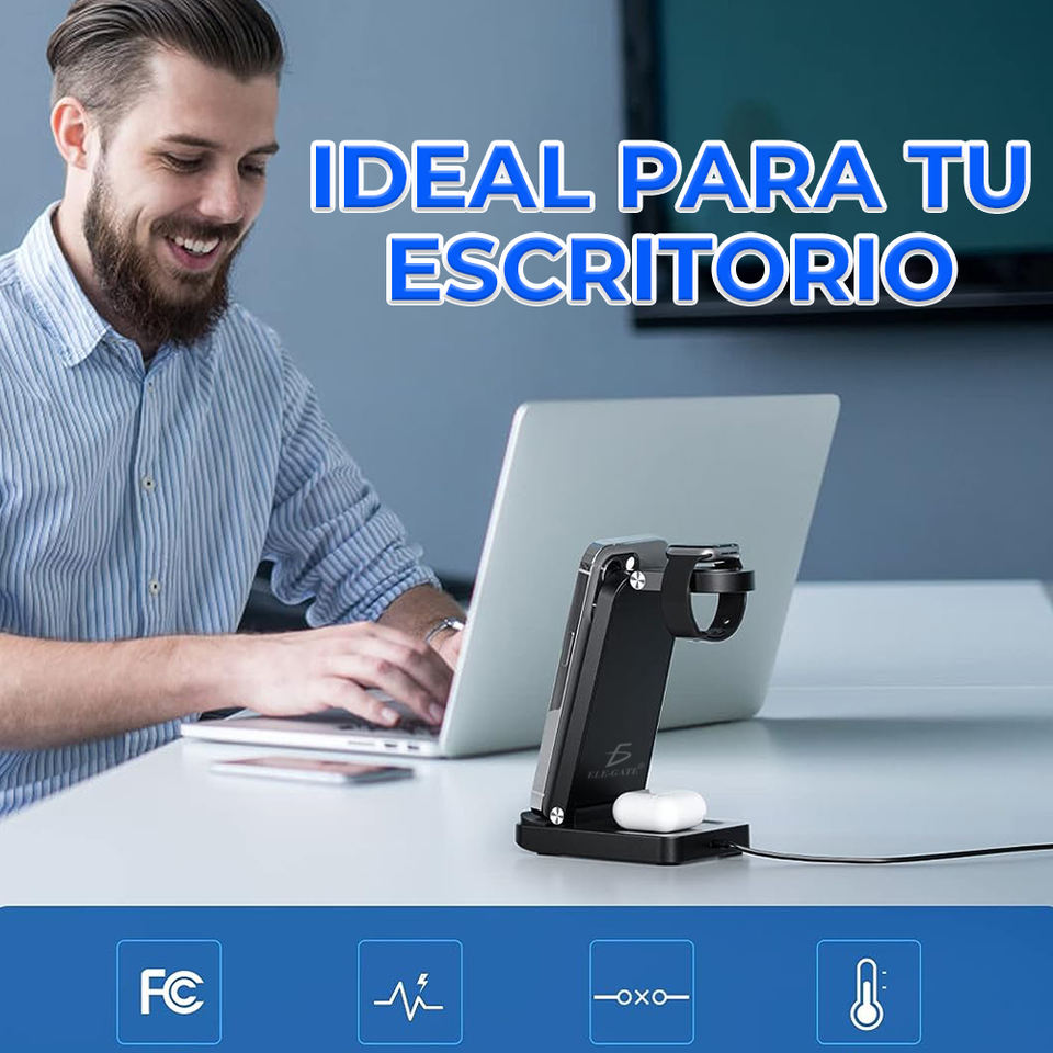 ELE-GATE 3 in 1 15W Stazione di Ricarica Wireless Certificata per Smartwatch e iPhone in Materiale ABS Resistente