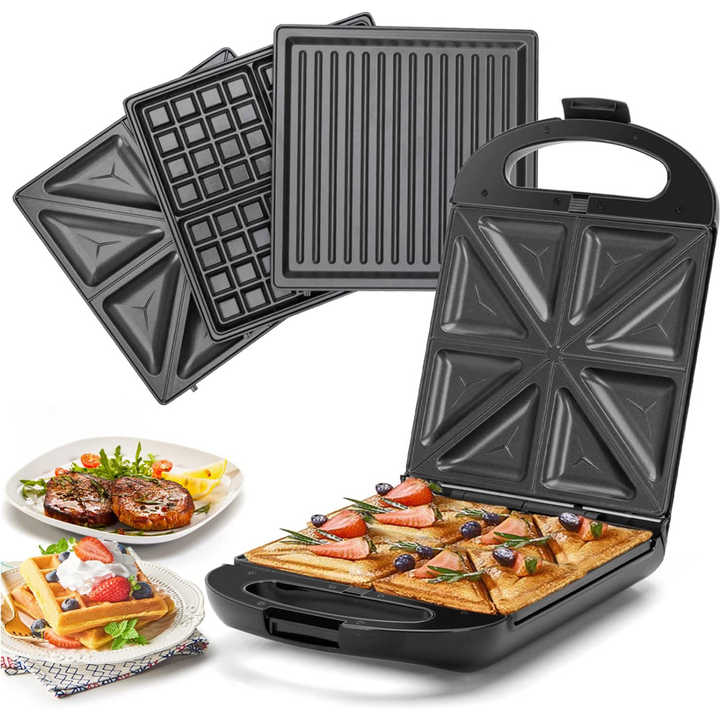3 in 1 Family Sandwich Toaster 4 Slice Waffle Maker Panini Press Deep Filled Removable Plates with Non-Stick Coating