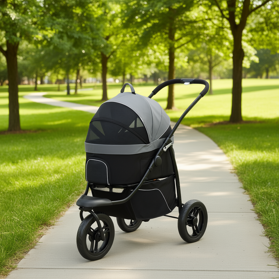 Passeggino grigio per cani e gatti di piccola taglia, trasportino staccabile con cestino portaoggetti, massimo 15 kg