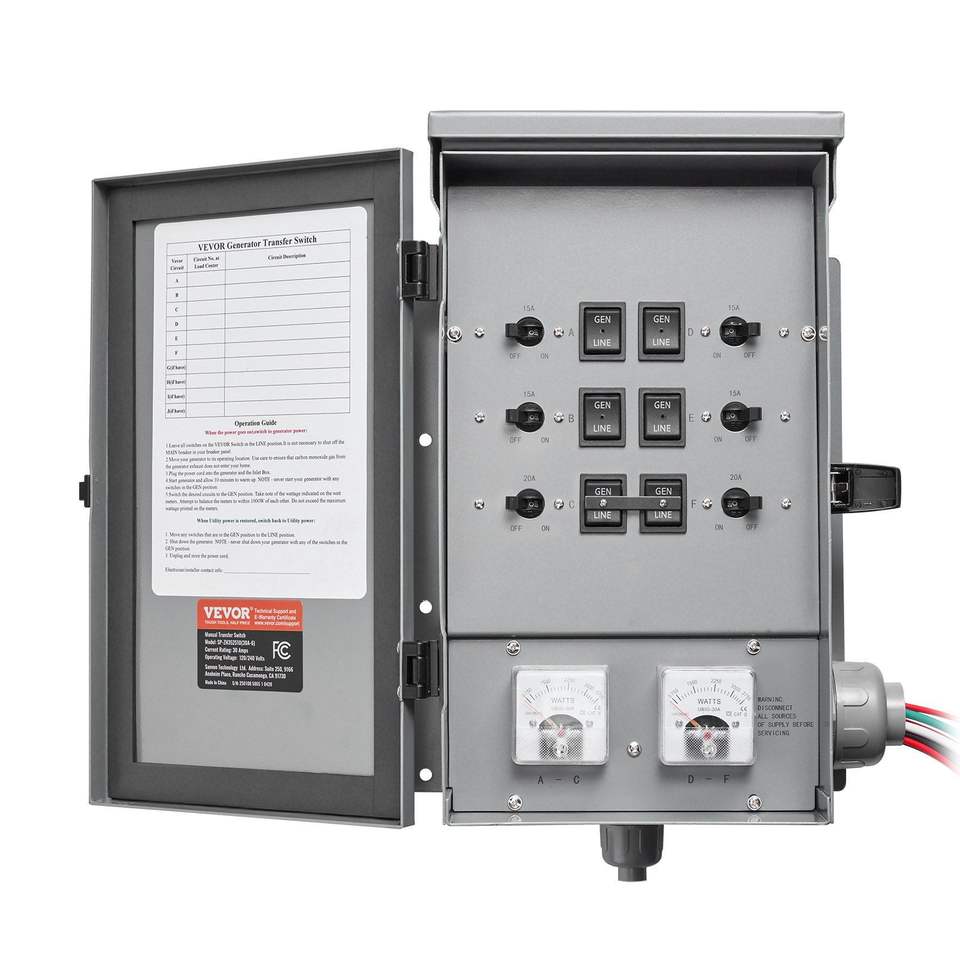 Kit Interruttore di Trasferimento Manuale ATS per Generatore, 30 Ampere, 6 Circuiti, Pre-cablato, con Scatola di Ingresso Alimentazione NEMA L14-30P a Doppia Ingressione