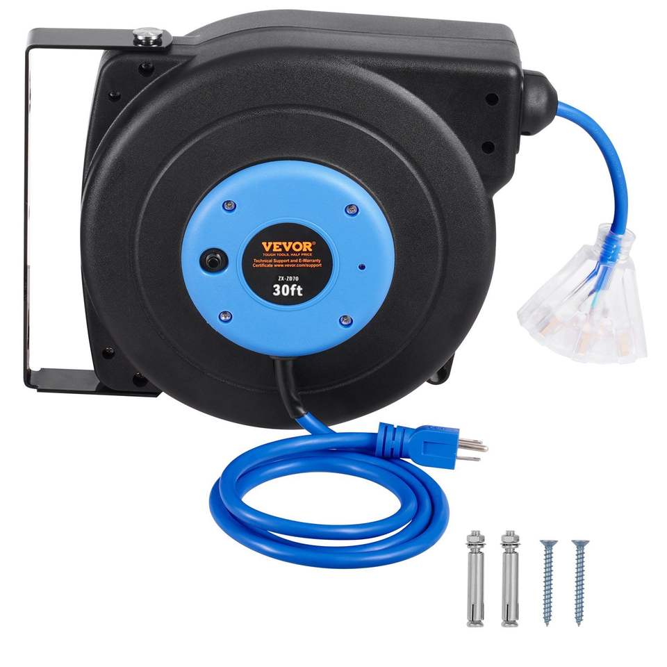 Avvolgicavo Elettrico Retrattile Professionale da 9 Metri con Cavo 16AWG/3C SJTOW, 10 Prese Multiple e Luce Integrata