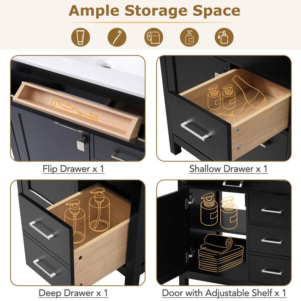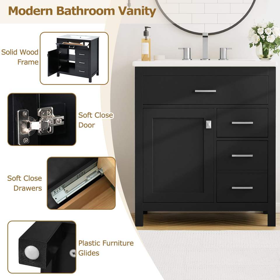Mobile da Bagno Nero da 30 Pollici con Ampio Spazio di Stoccaggio e Lavabo in Ceramica per Bagni Piccoli