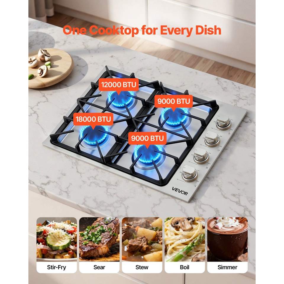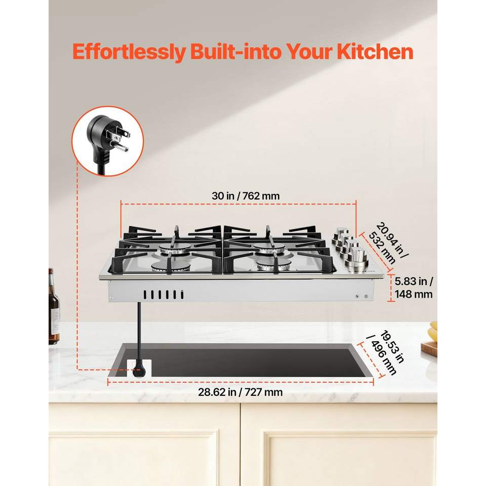 Piano Cottura a Gas Incasso in Acciaio Inox da 30 Pollici con 4 Bruciatori, Capacità Massima 48000 BTU, Convertibile GPL/Gas Naturale, Doppia Alimentazione