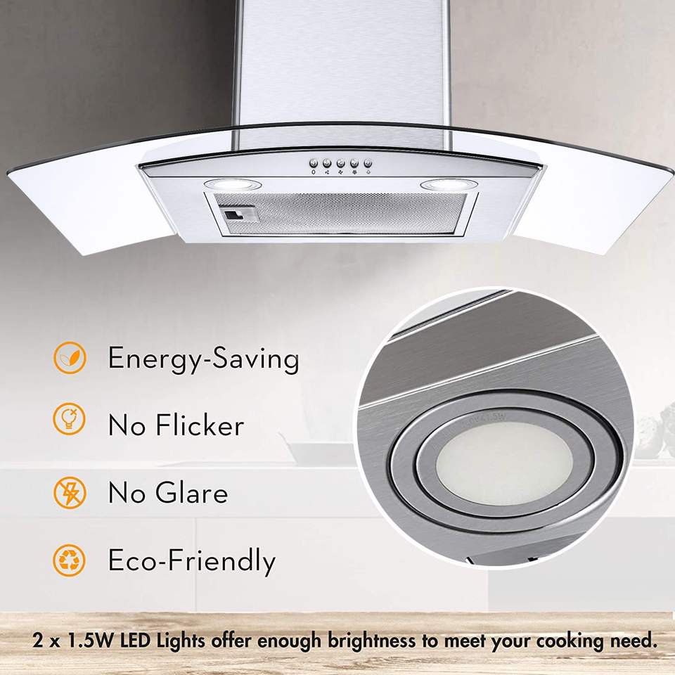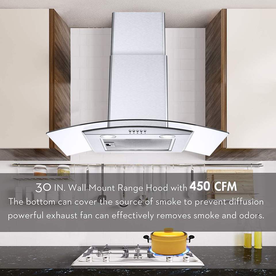 Cappa aspirante da parete da 30 pollici 450CFM in vetro temperato con ventilazione, ventola a 3 velocità e luci LED