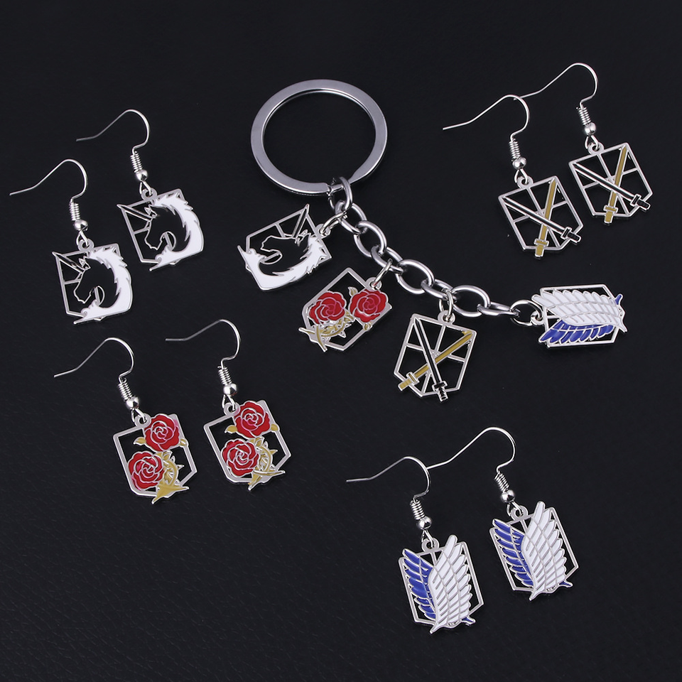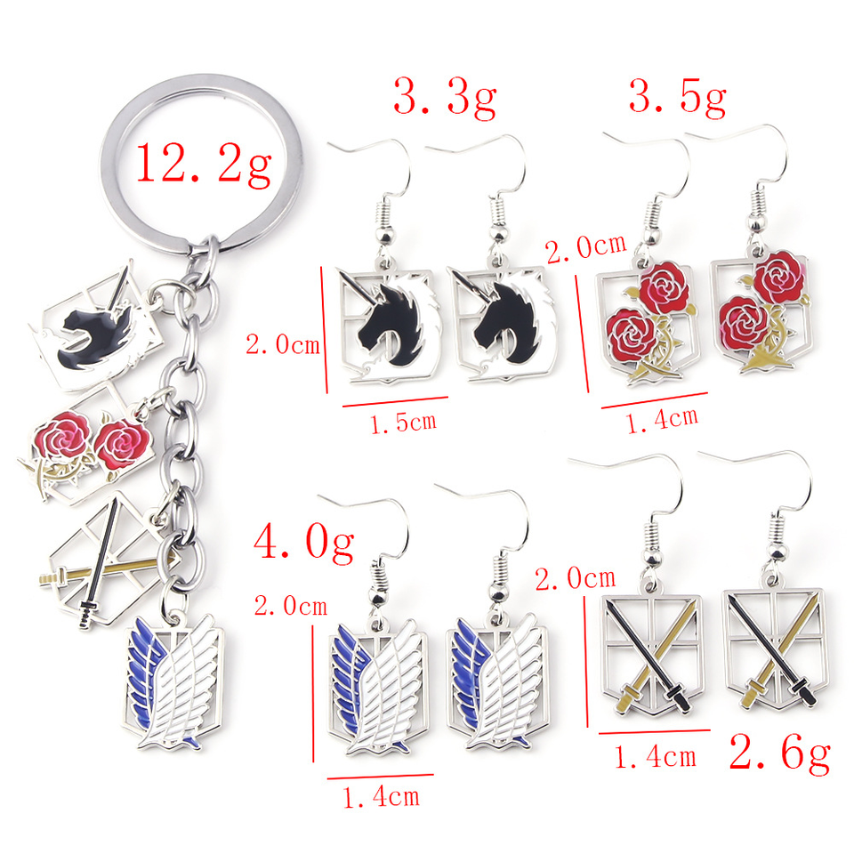 Set di 30 Nuovi Design Anime AOT: Portachiavi in Metallo con Logo dei Quattro Reggimenti del Titano, Collana Ali della Libertà e Orecchini