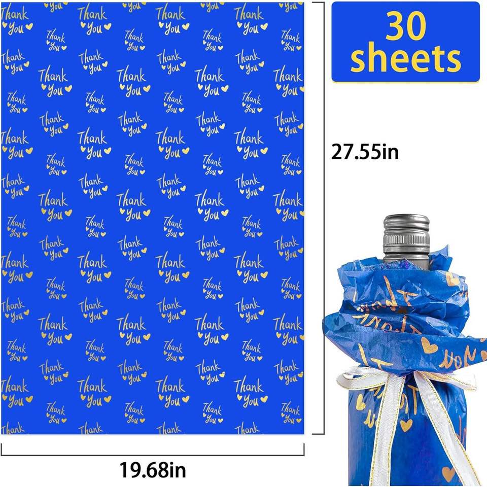 30 Fogli di Carta Velina Blu e Oro 'Grazie' 50x70 cm, Confezione Grande per Sacchetti Regalo e Imballaggi Blu Navy