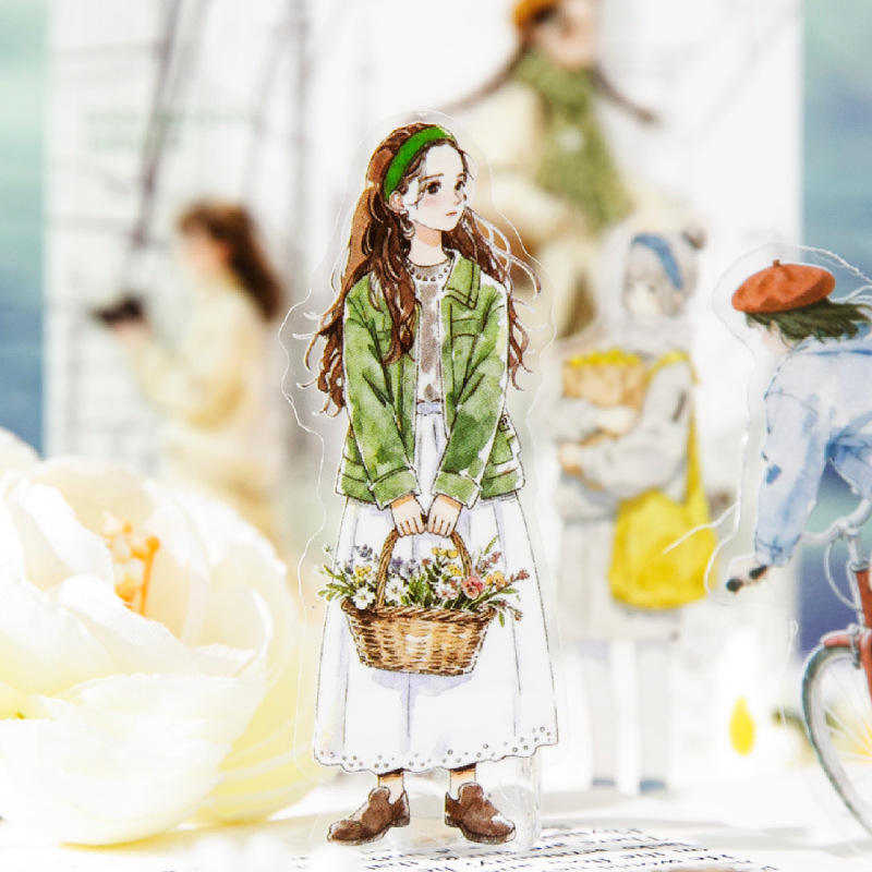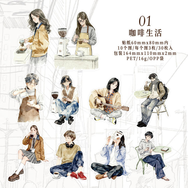 30 Fogli/Pacco di Adesivi PET con Tema Retrò di Personaggi e Angoli di Strada, Decorazioni Fai-da-Te per Quaderni e Cover per Telefoni