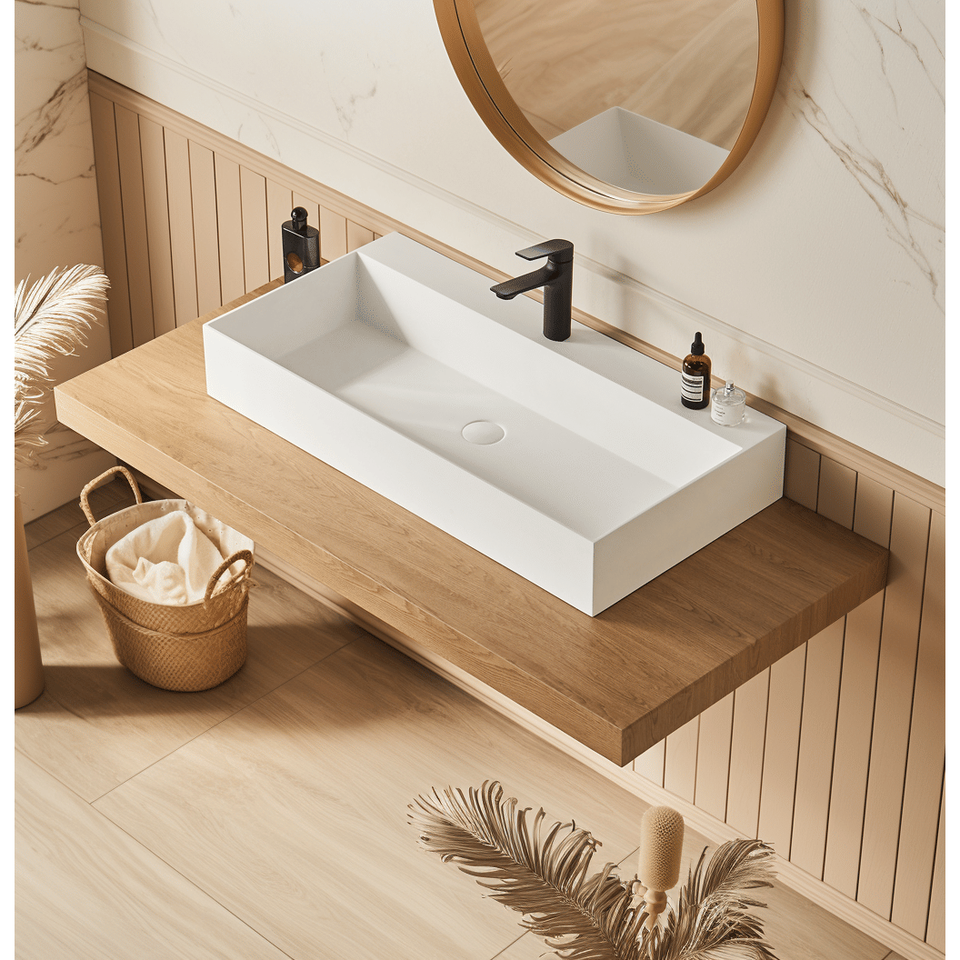 30\" X 18\" Solid Surface Matte White Rectangle Vessel Sink with Faucet Hole Wall Mount for Bathroom Use