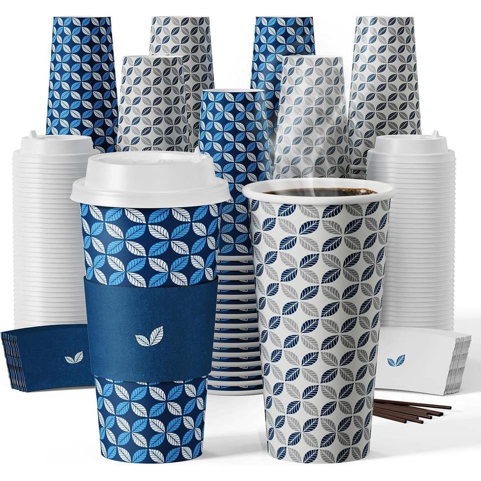Confezione da 300 Bicchieri di Carta Monouso Blu da 20 oz per Caffè Caldo con Coperchi, Manicotti e Agitatori per Casa, Ufficio e Caffetteria