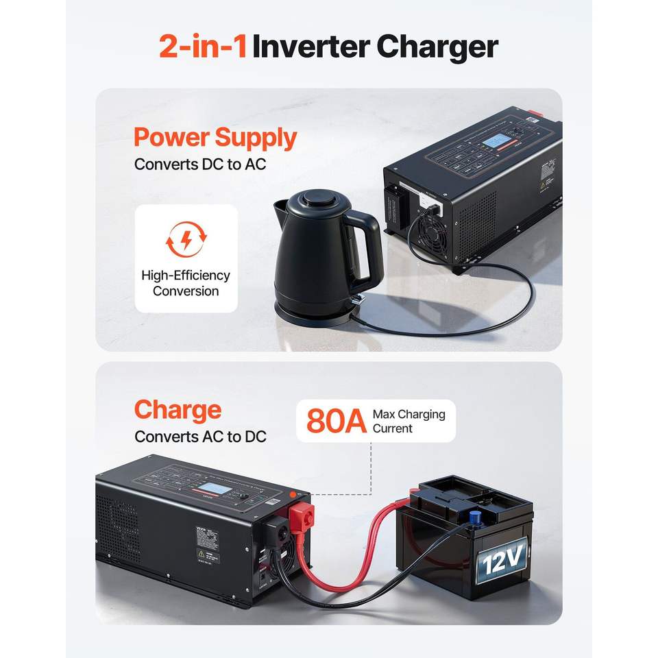 Inverter a Onda Sinusoidale Pura 3000W con Caricabatterie DC 12V AC 120V, Display LCD e Telecomando per Sistemi Solari a Bassa Frequenza
