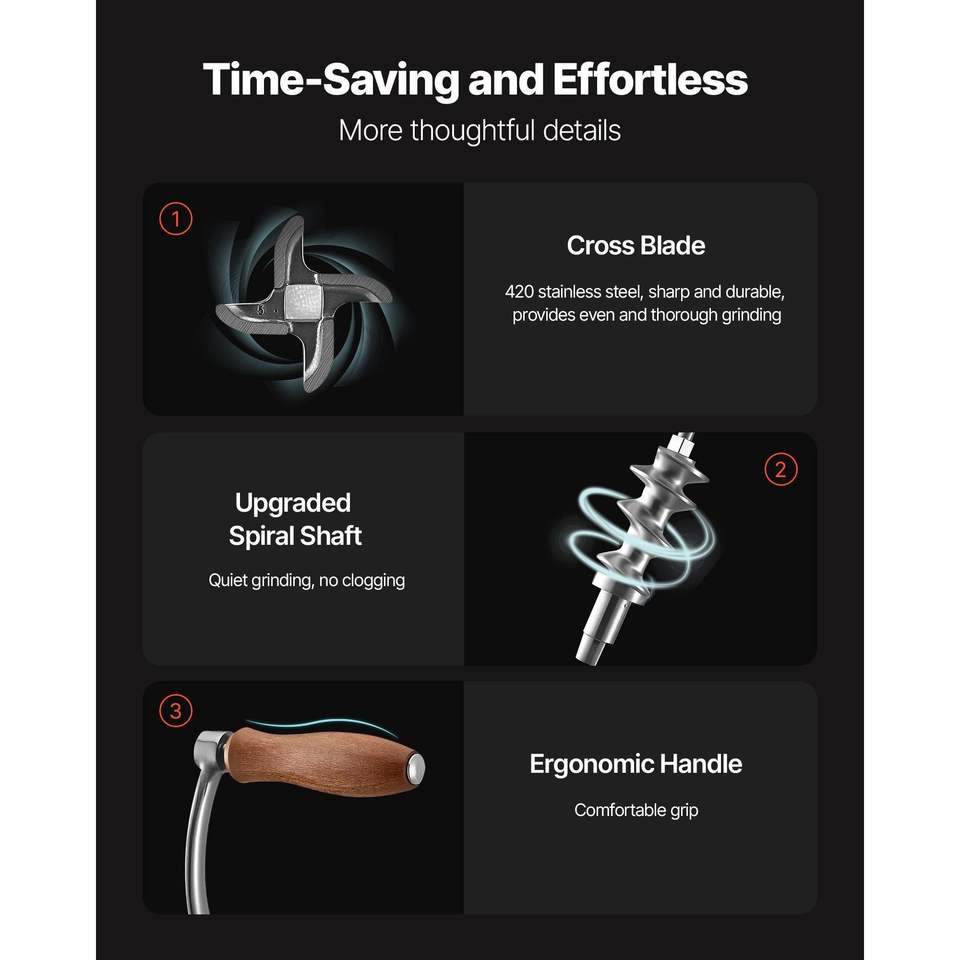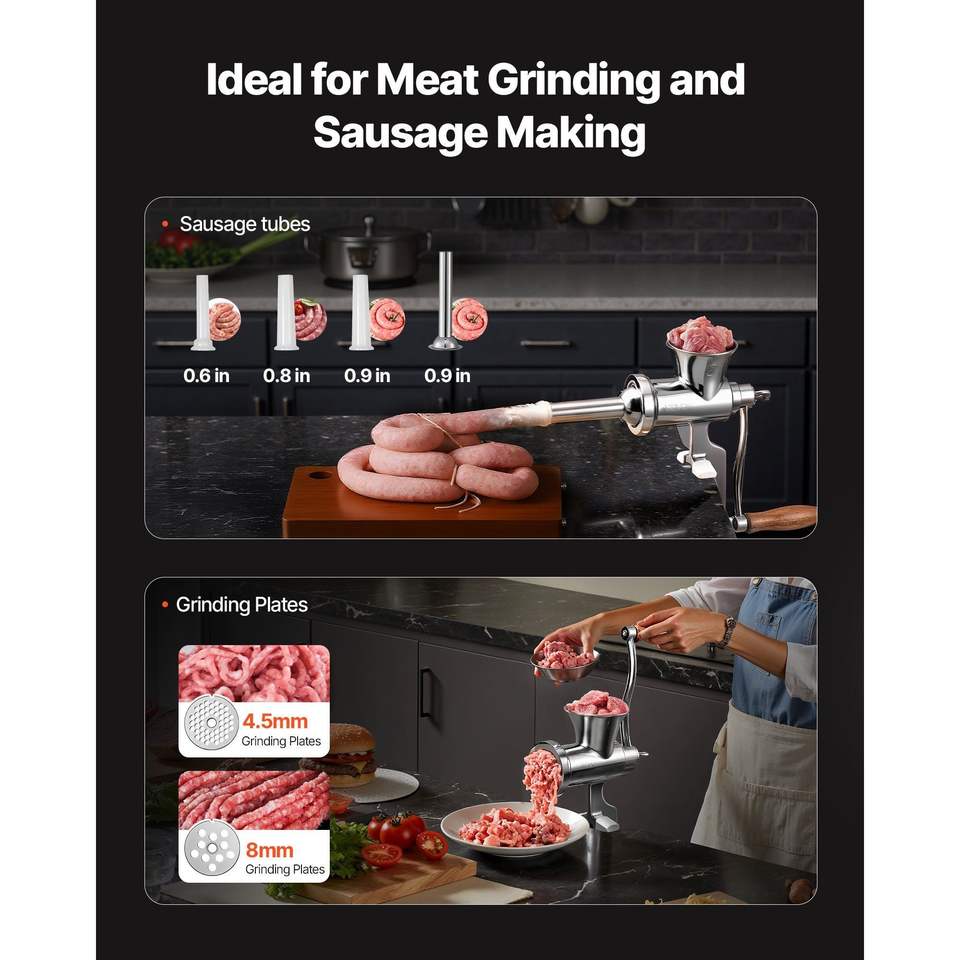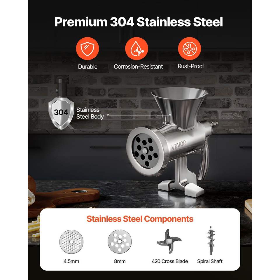 304 Stainless Steel Manual Meat Grinder with Hand Crank Table Clamp & Sausage Stuffer 2 Cutting Plates for Poultry & Meat Tools