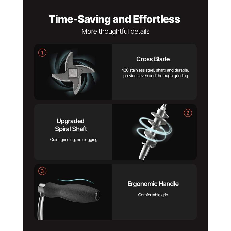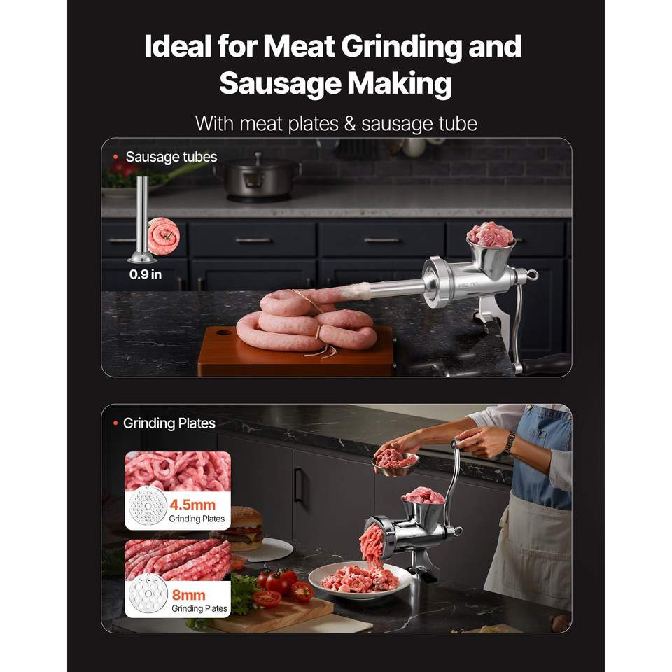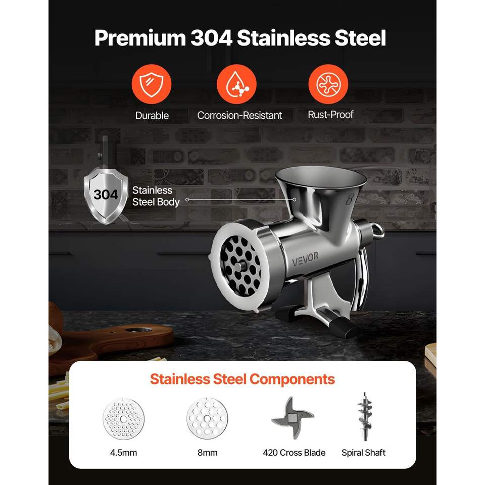 Tritacarne Manuale in Acciaio Inox 304 con Morsetto da Tavolo e Insaccatrice, 2 Dischi di Taglio