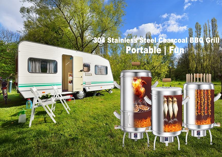 Griglia Barbecue Portatile a Carbone per Kebab e Girarrosto per Pollo in Acciaio Inox 304 per Campeggio all'Aperto e Affumicatore
