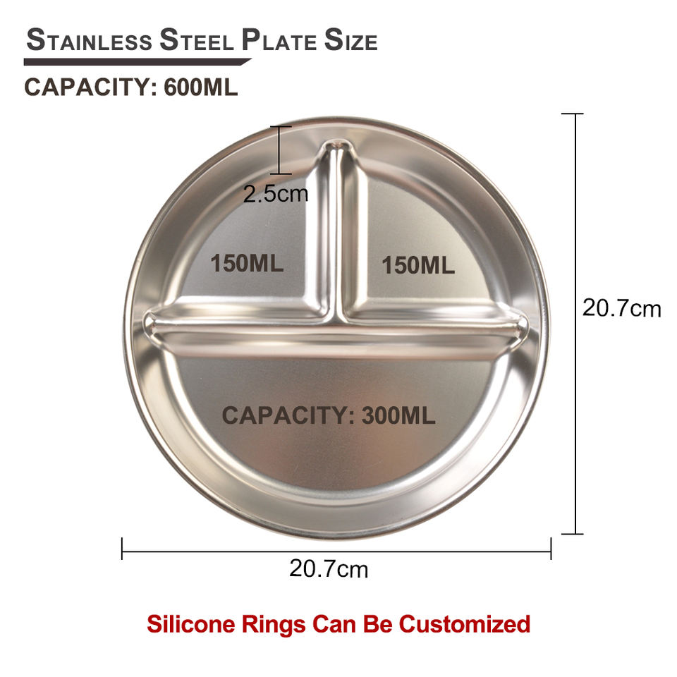 304 Stainless Steel Silicone Kids Baby Dinner Compartment Divided Plates and Dishes with Suction for Kitchen