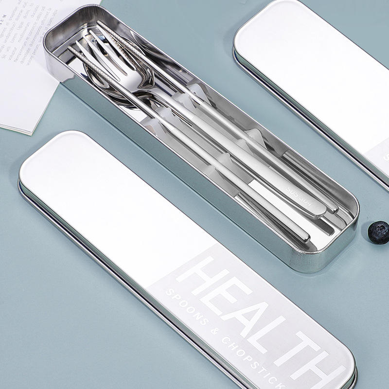 304 Stainless Steel Student Suit Picnic Campus Work Meal Fork and Spoon Portable Tableware Box Three-Piece Set Storage Box