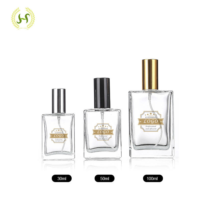 30ml 50ml 100ml quadrato con tappo a vite vuoto trasparente bottiglia di profumo in vetro nebbia Fine con Spray nero argento oro