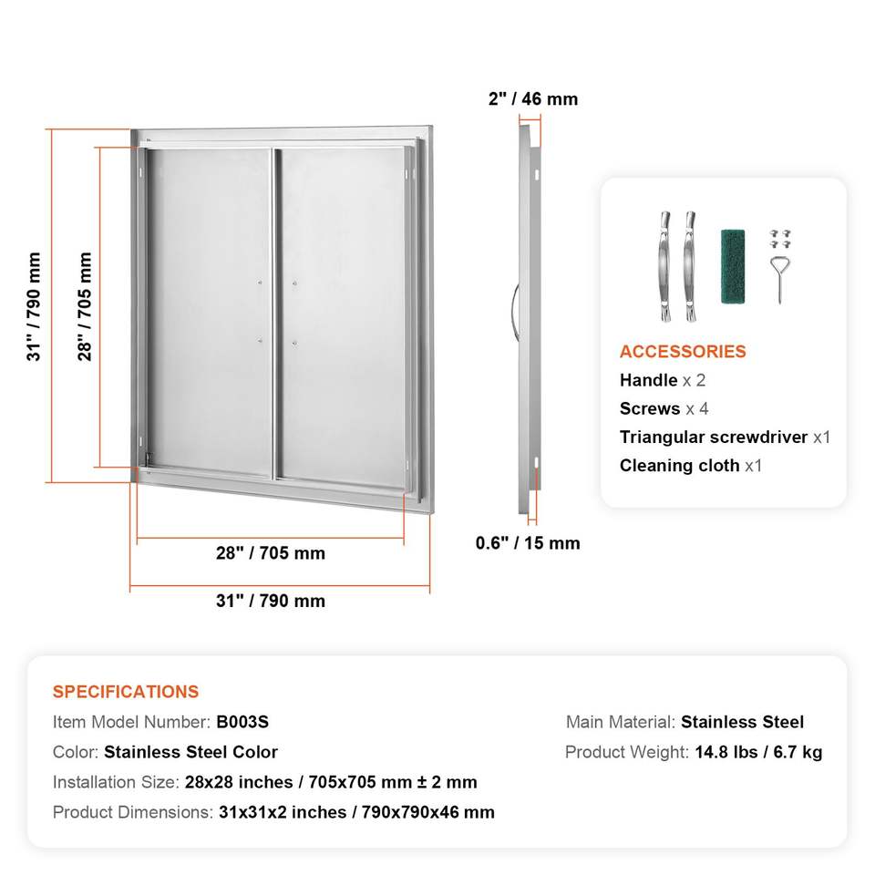 Porta di accesso BBQ doppia in acciaio inox da 31W x 31H pollici per cucina esterna, montaggio a incasso a parete, con maniglie verticali per lo stoccaggio