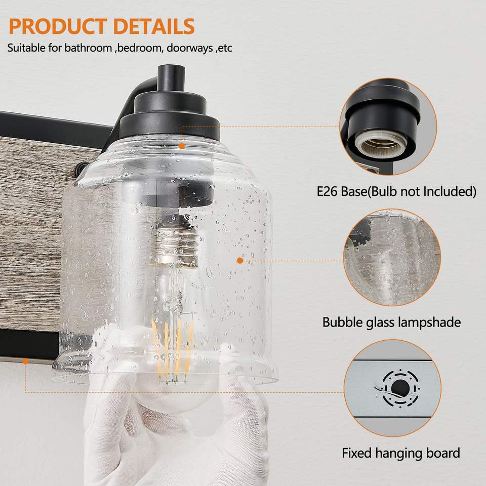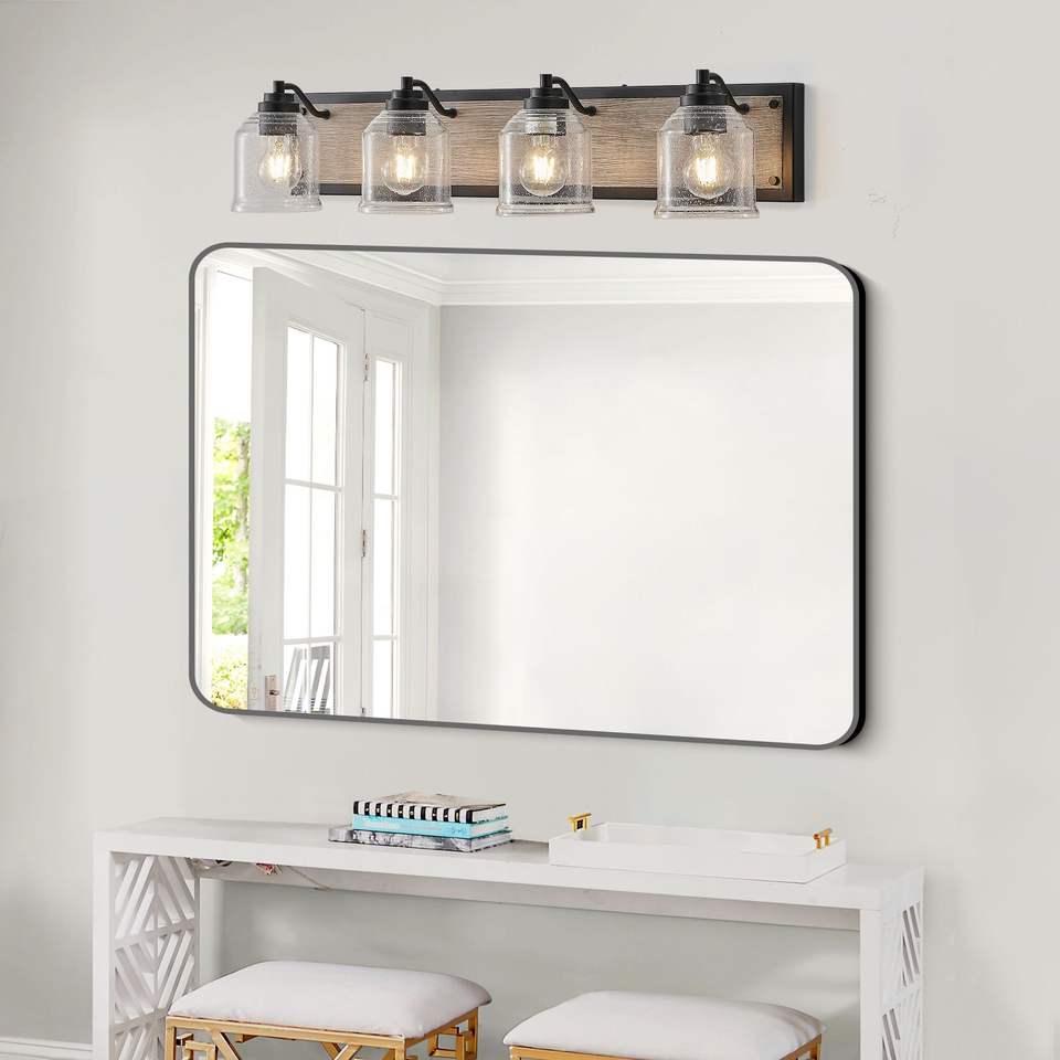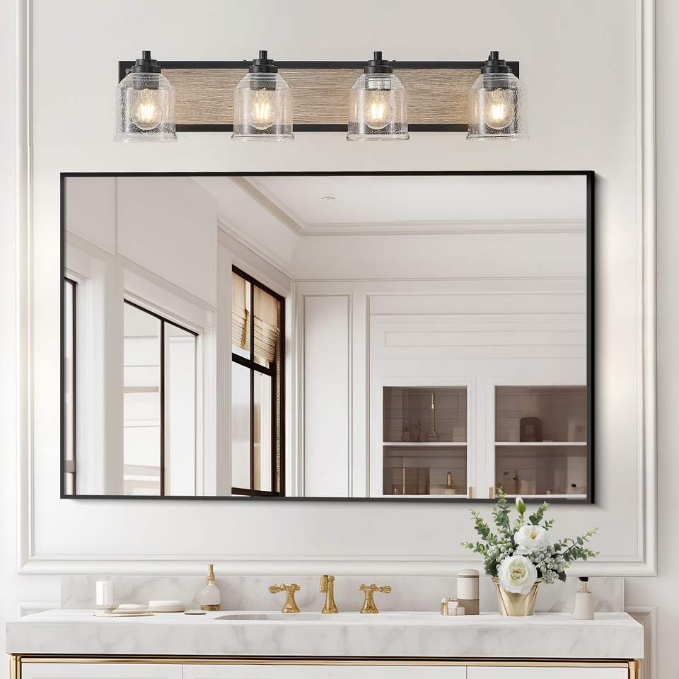 Lampada da parete per bagno stile rustico da 32 pollici a 4 luci con paralumi in vetro smerigliato trasparente e finitura in legno nero