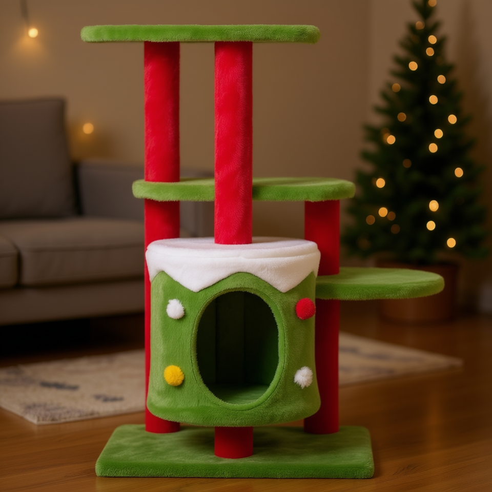 Albero per gatti a tema natalizio, 32 pollici, 3 livelli, cuccia in peluche con posti per grattare per gatti da interno