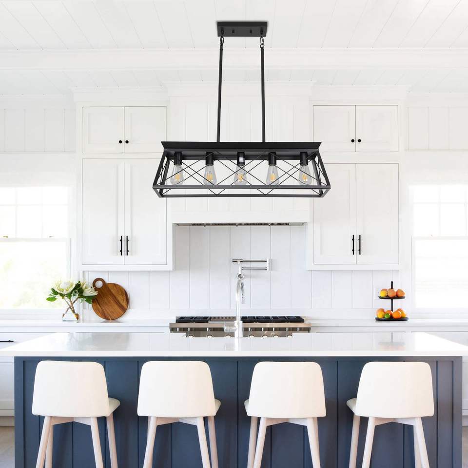 Lampadario a sospensione moderno da 32 pollici con gabbia in metallo, 5 luci, nero, stile industriale, regolabile per sala da pranzo e cucina
