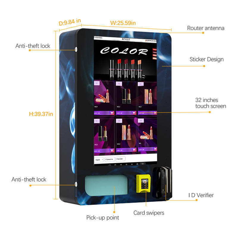 Distributore Automatico Compatto da 32 Pollici con Schermo Touch, Montaggio a Parete, Verifica dell'Età, Pagamento Cashless, Monitoraggio Remoto Basato su Cloud