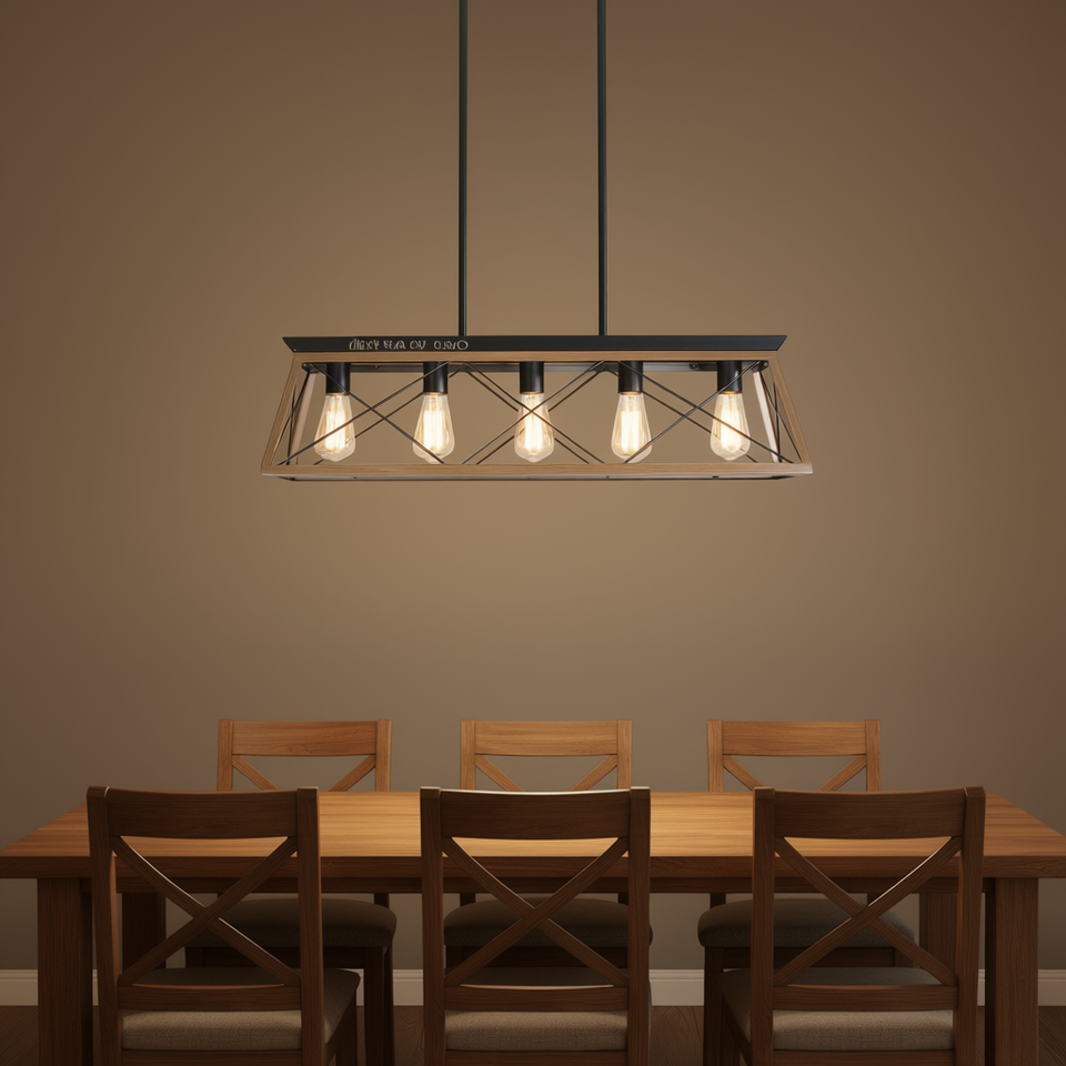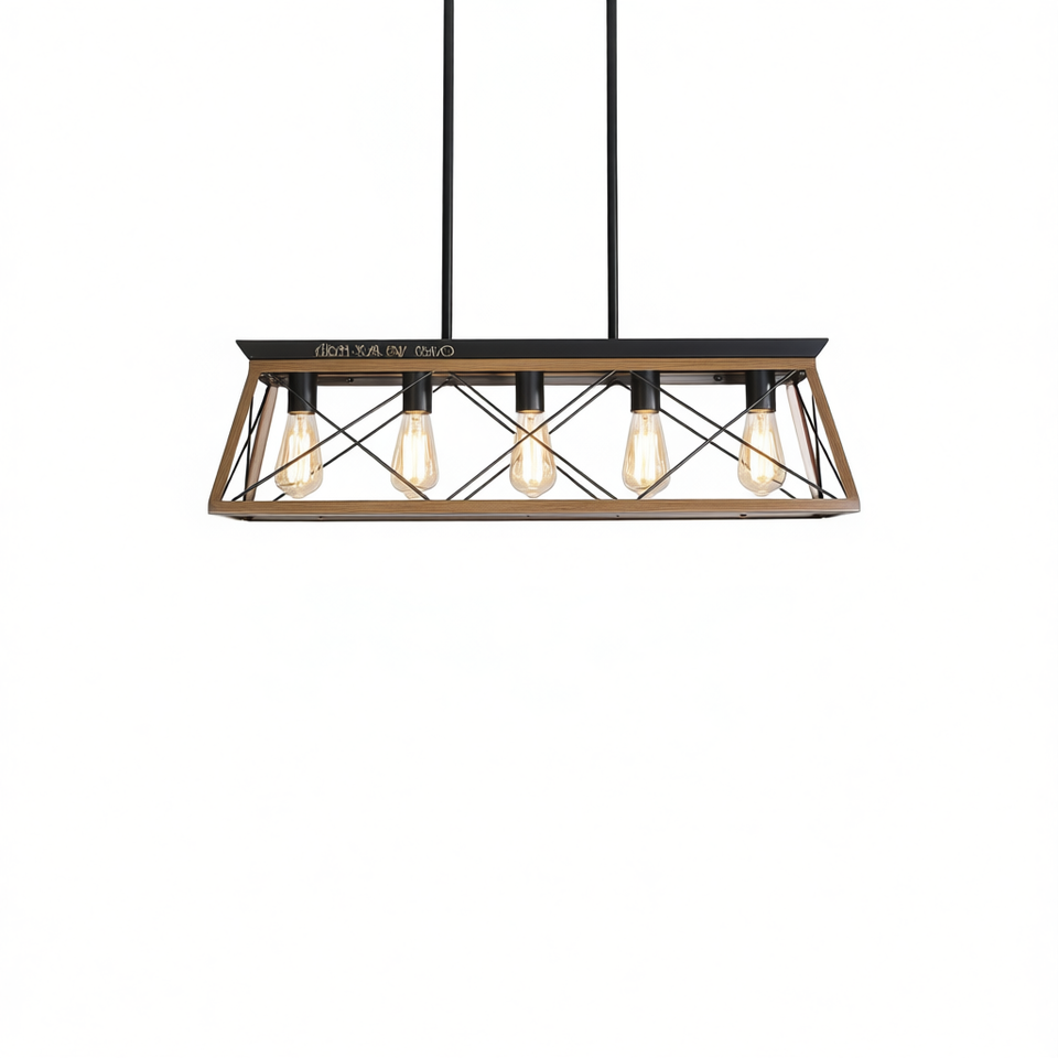 Modern Walnut Industrial 5-Light Pendant Chandelier Adjustable Metal Cage Design Dining Room Hanging Light