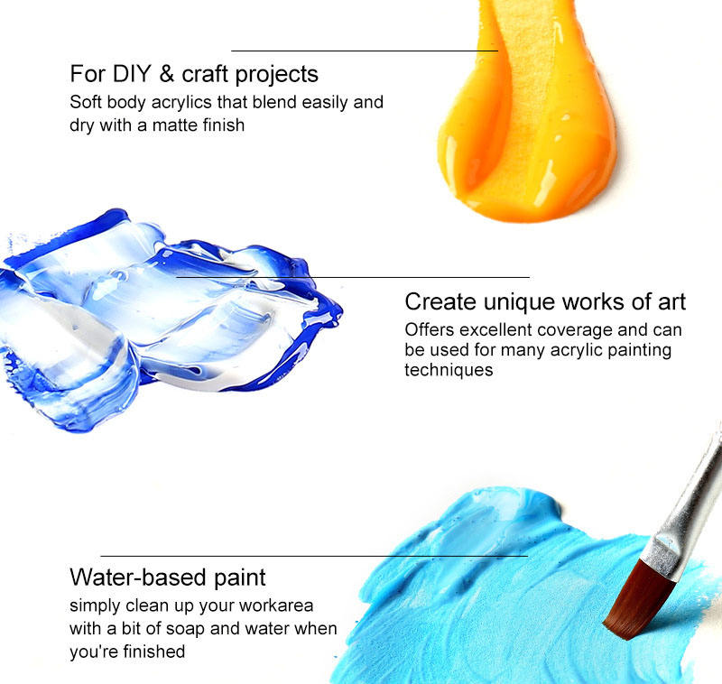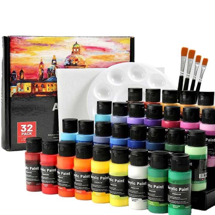 Confezione da 32 24 colori vernice acrilica senza sbiadimento Set di colori acrilici opachi con pigmenti ricchi con 6 pennelli, 1 tavolozza, 1 pannello di tela