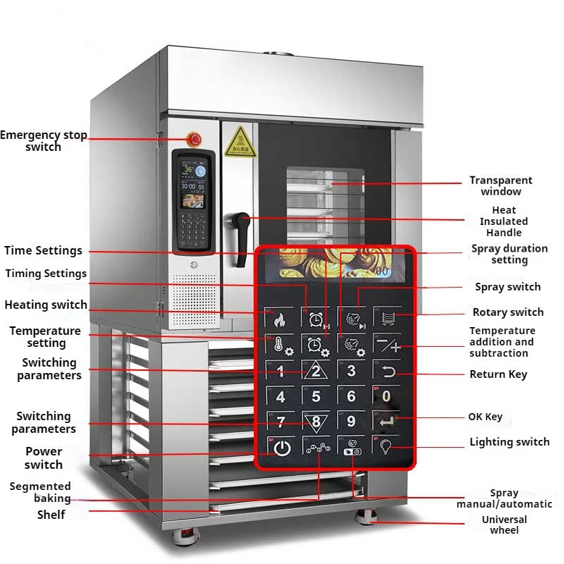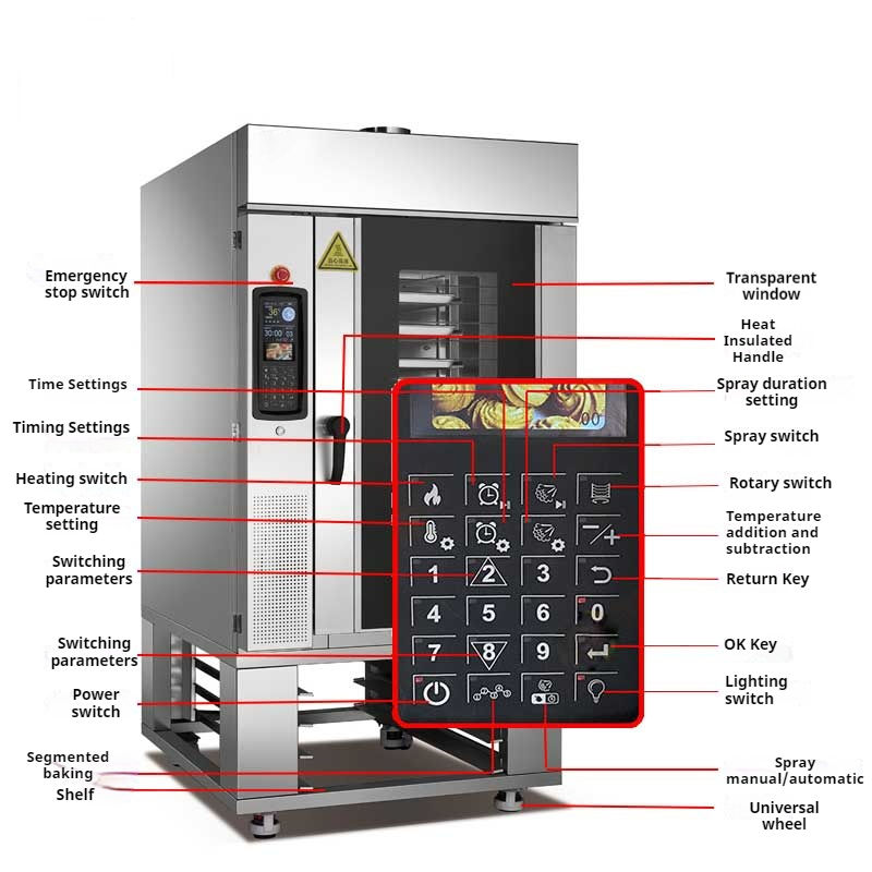 Machinery Function:double layer insulation layer, adjustable segmented air outlet, rotating platform, colling fan, adjustable vertical air inlet, heating system protection, programmable temp control, uniform color of food, visual baking, high tenperature saturated steam