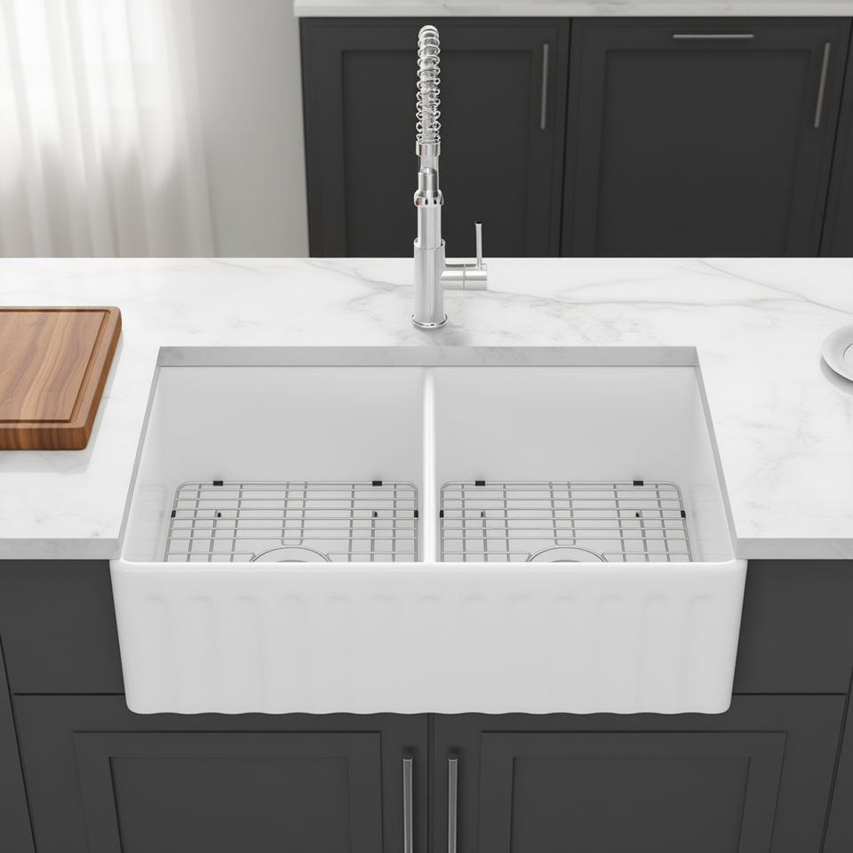 Lavello da Cucina a Doppia Vasca in Ceramica Bianca Stile Rustico 33 Pollici con Installazione a Incasso su Piano di Lavoro Finitura Opaca