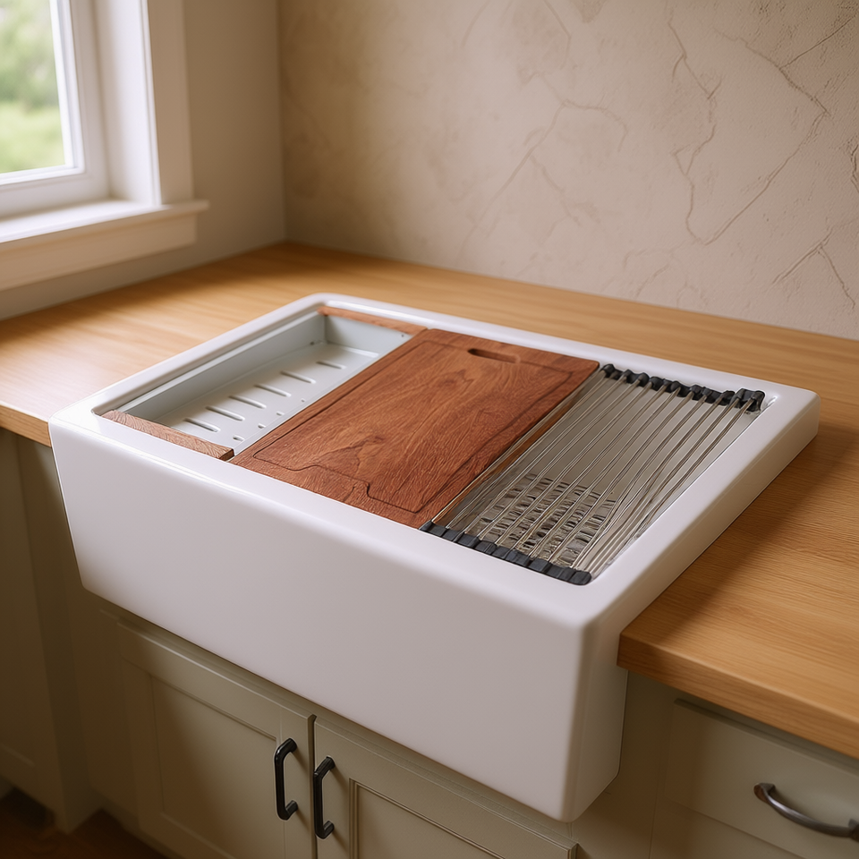 Lavello da Cucina in Ceramica Bianca a Vasca Singola Stile Rustico 33 Pollici Installazione Sopra Piano Finitura Opaca Multifunzionale