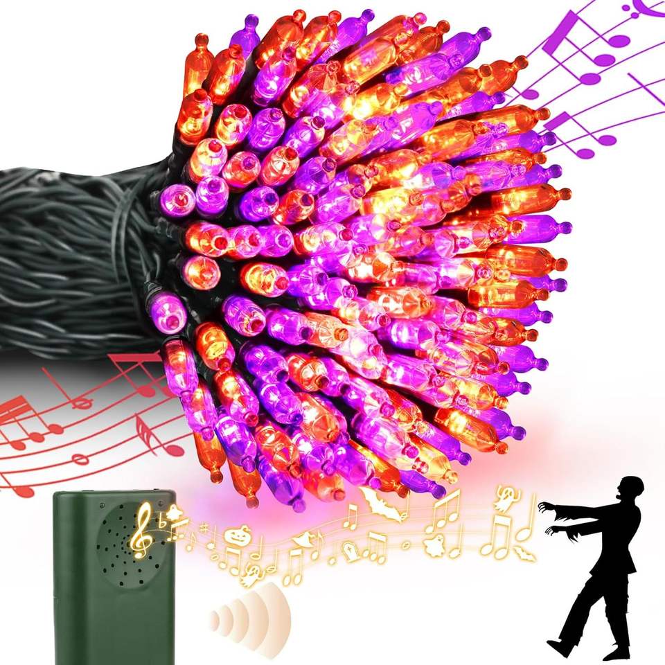 Luci a stringa a batteria da 33 piedi con 100 LED, sensore di musica e movimento per Halloween, arancione e viola, 2 colori