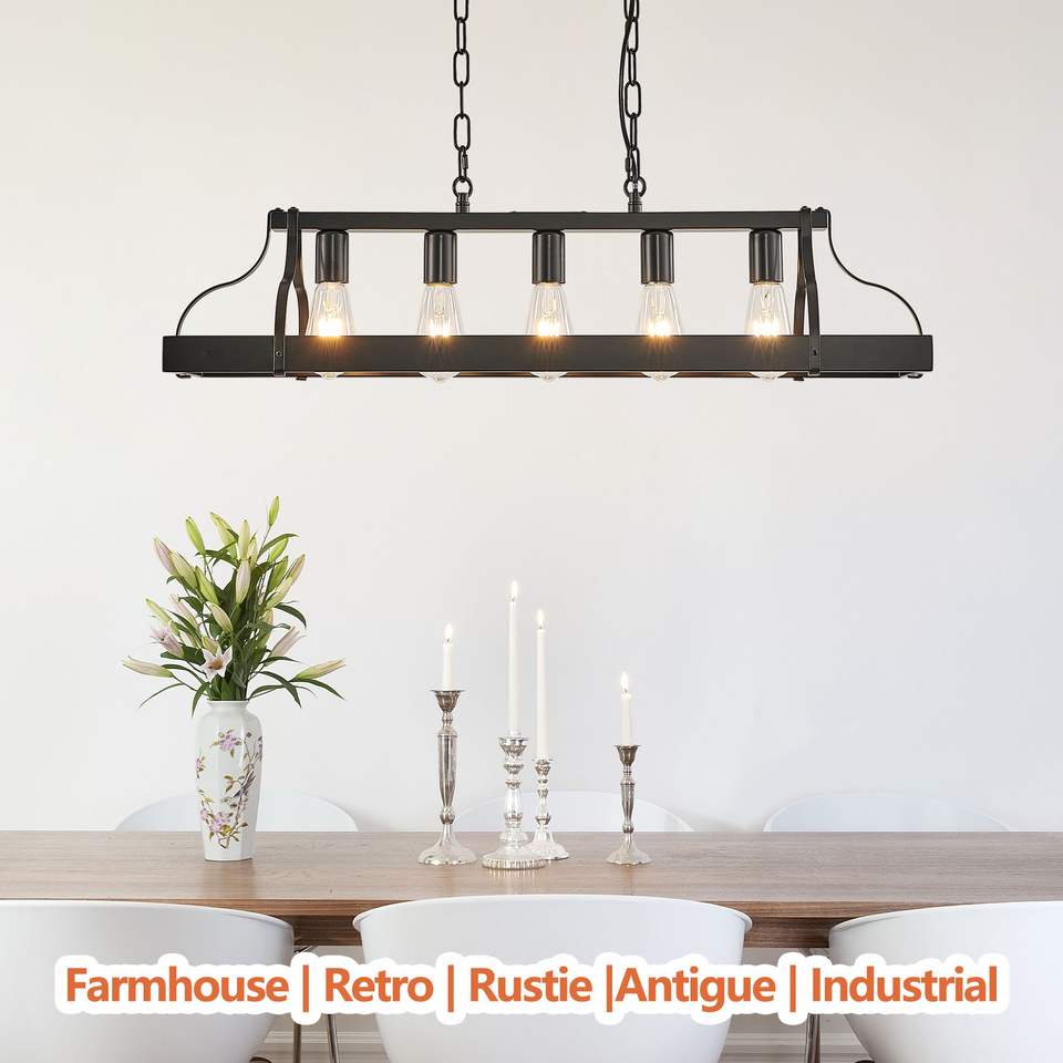 Lampadario Lineare Moderno Stile Fattoria da 34 Pollici, Nero, Industriale, con 5 Portalampade E26, Altezza Catena Regolabile