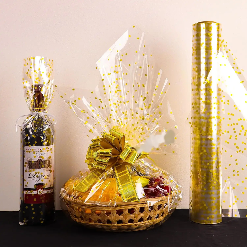 34 \ "X 120 ft rotolo avvolgente a pois in oro 3Mil rotolo di pellicola in plastica per regalo