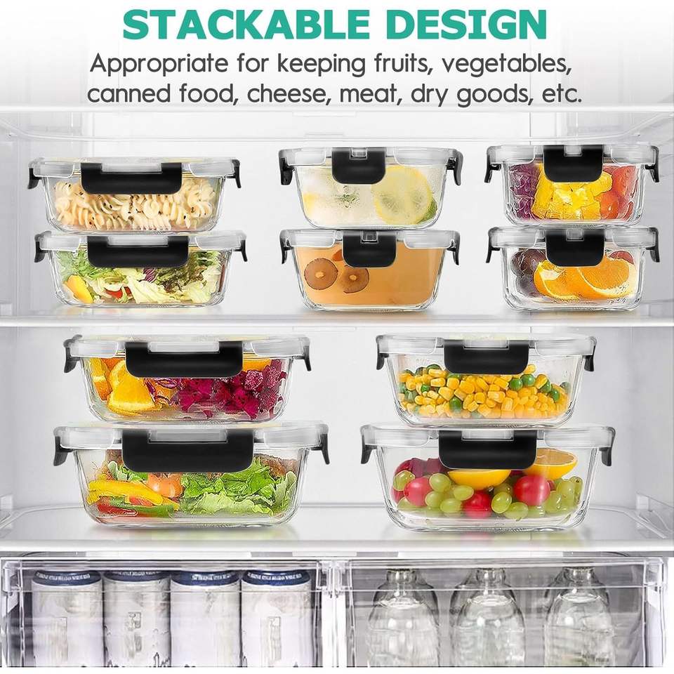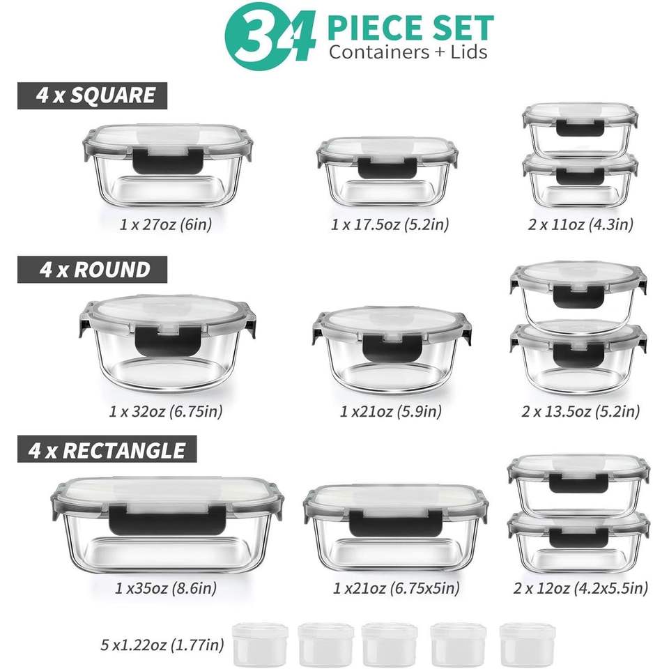 Set di 34 Contenitori in Vetro Ermetici e Anti-Perdita per Pranzo e Preparazione Pasti con 17 Contenitori e Coperchi (Modello D0100XF9J4W)