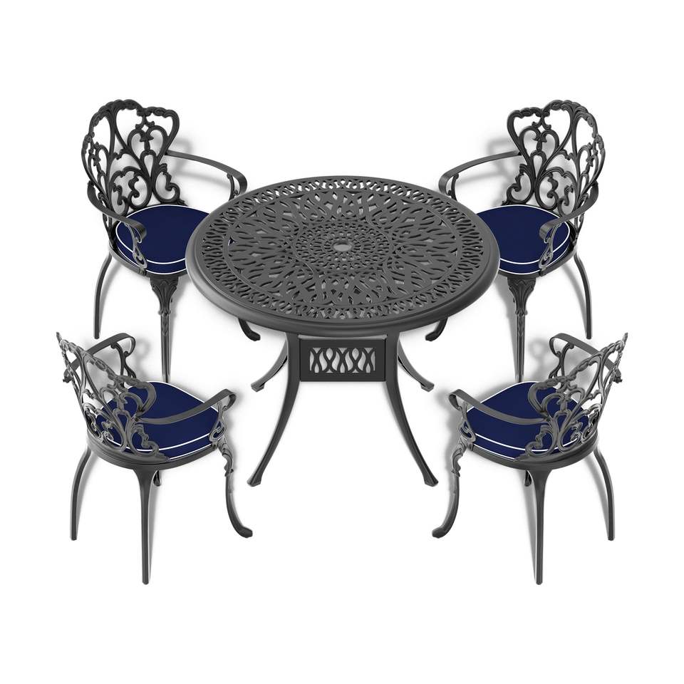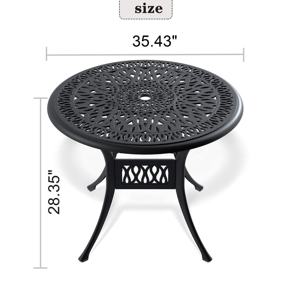 35.43 Inch Cast Aluminum Patio Dining Table with Black Frame and Umbrella Hole for Outdoor Use