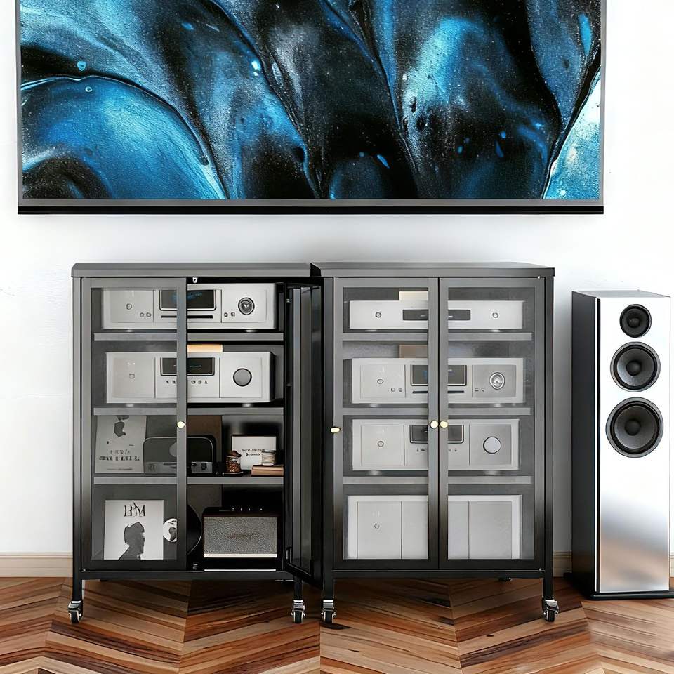 Mobiletto Porta TV da 91 cm con Struttura in Acciaio Resistente, 4 Ripiani in Vetro Regolabili, Supporto per TV e Stereo AV con Ruote per Soggiorno