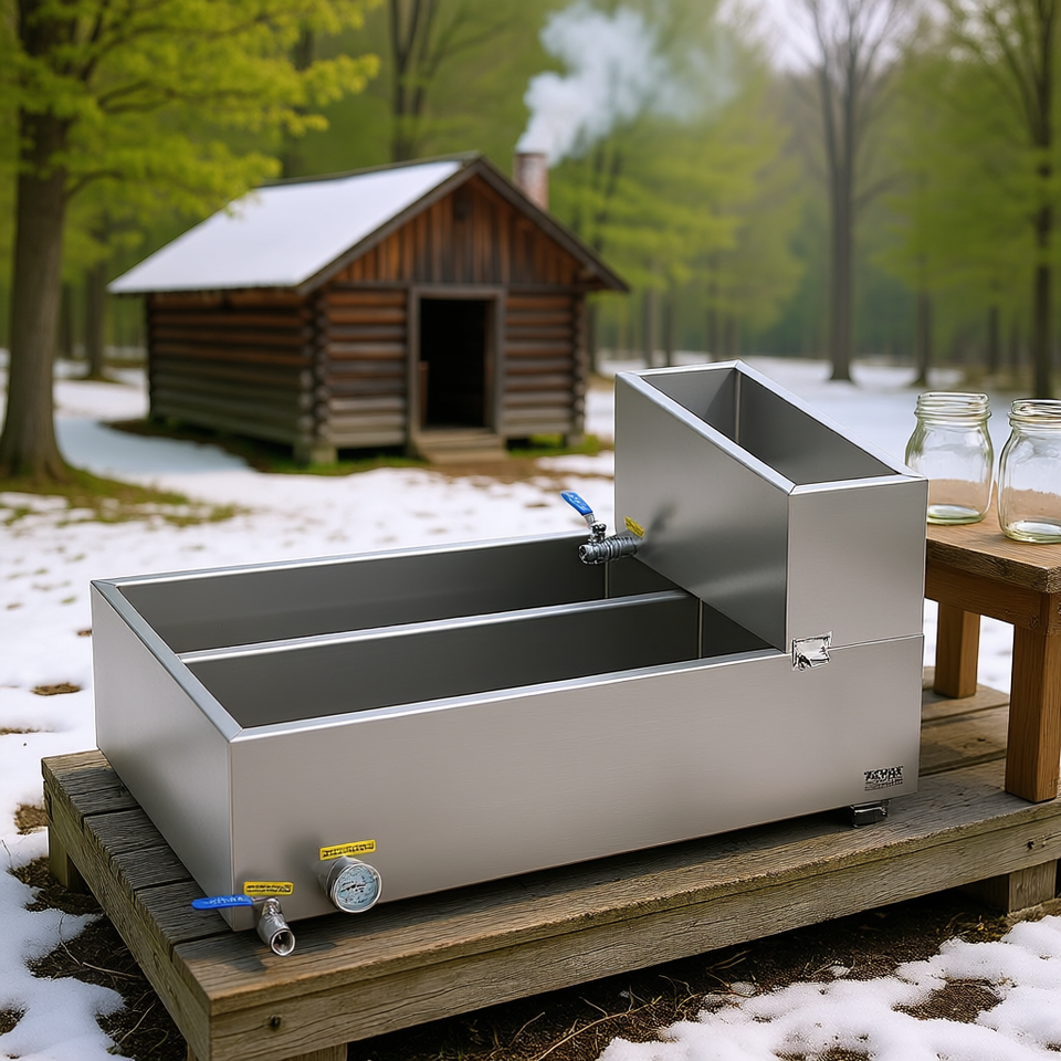 Vasca evaporatrice per sciroppo d'acero in acciaio inox da 35 galloni, design piatto, 2 valvole, per uso esterno
