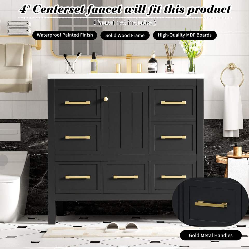 Mobile da Bagno 36'' con Struttura in Legno Massello, Armadietto con 5 Cassetti, Ante a Chiusura Morbida, Lavabo in Resina, Set Autoportante